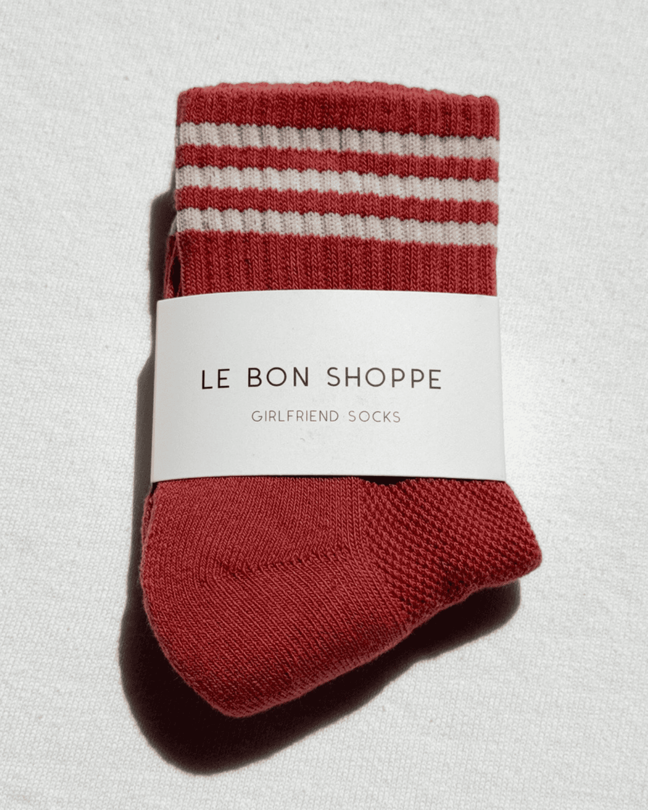 these stylish girlfriend socks by le bon shoppe feature a shorter length + bold triple stripe at the top.  perfect for lounging around the house, chasing your toddler, or as an easy pairing for an every day look, these socks are comfortable + versatile.  also great for a new mom gift, teacher gift, or an every day essential for yourself.