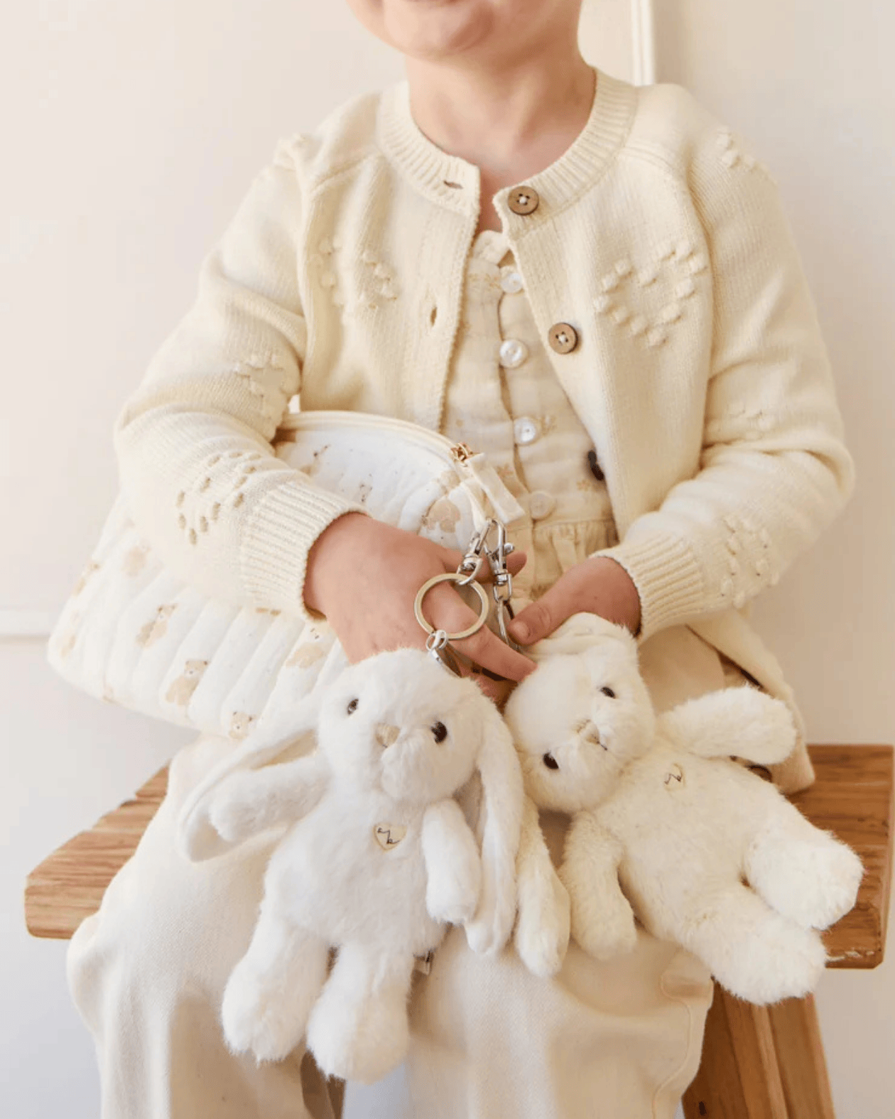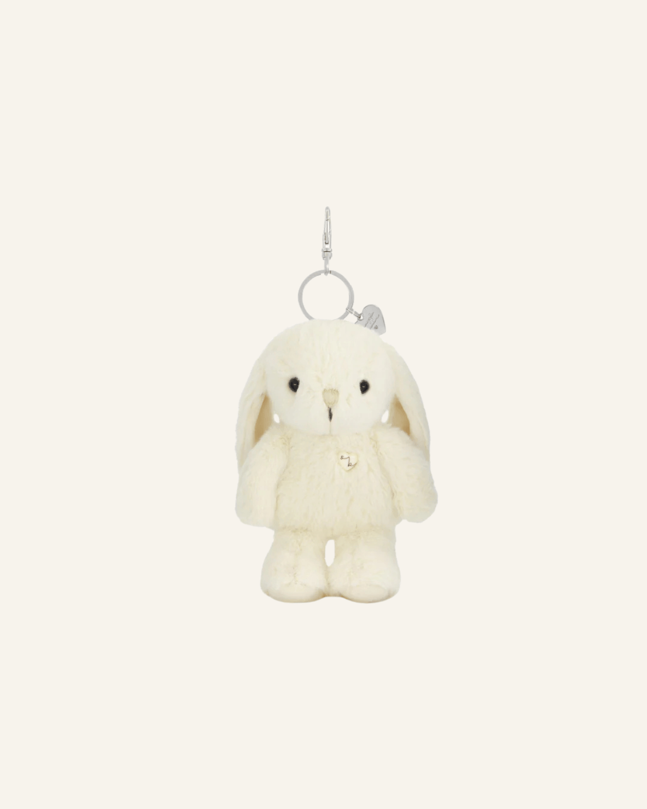 now take your favorite snuggle bunnies on the go - with the new penelope the bunny keyring from jamie kay. this sweet little bunny is perfect to attach to your little's favorite bag + travel with them. keyring attached to an easy clip that opens with a pull down tab, perfect for adding some sweetness to any backpack.