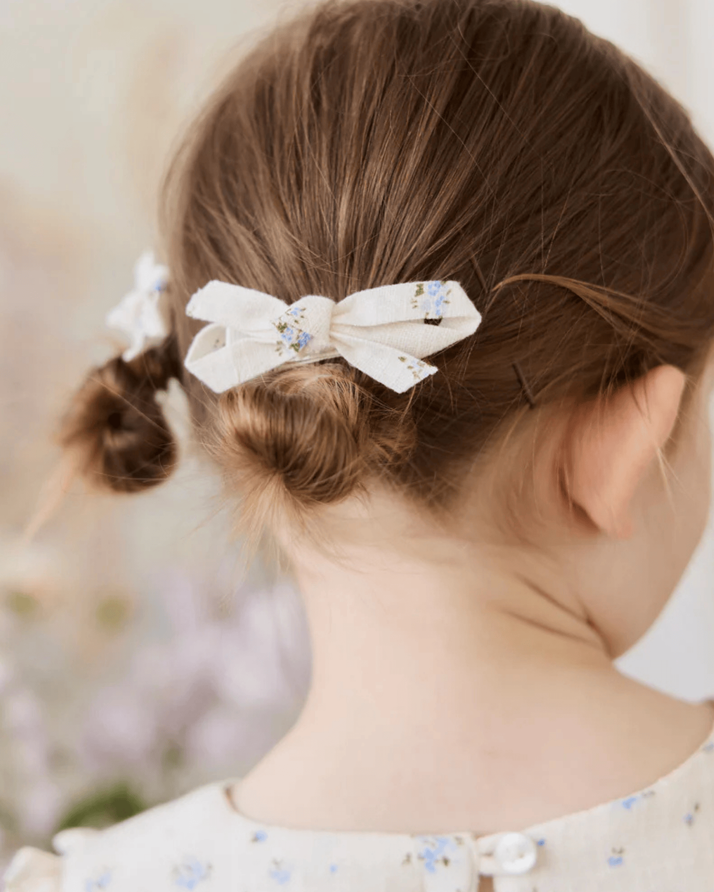 add a touch of sweet charm to your little one’s outfit with the jamie kay nathalie bow, in juniper fields blue. featuring a delicate floral print + a classic bow shape, this accessory is perfect for completing any look with a dreamy, vintage-inspired touch.