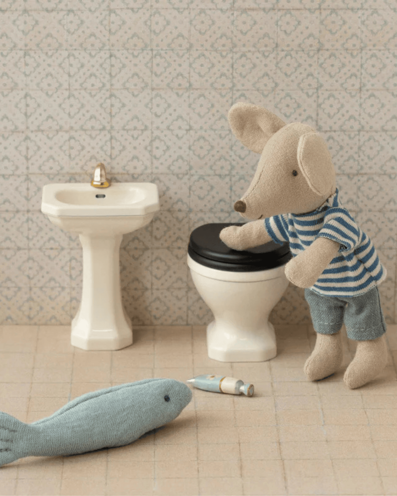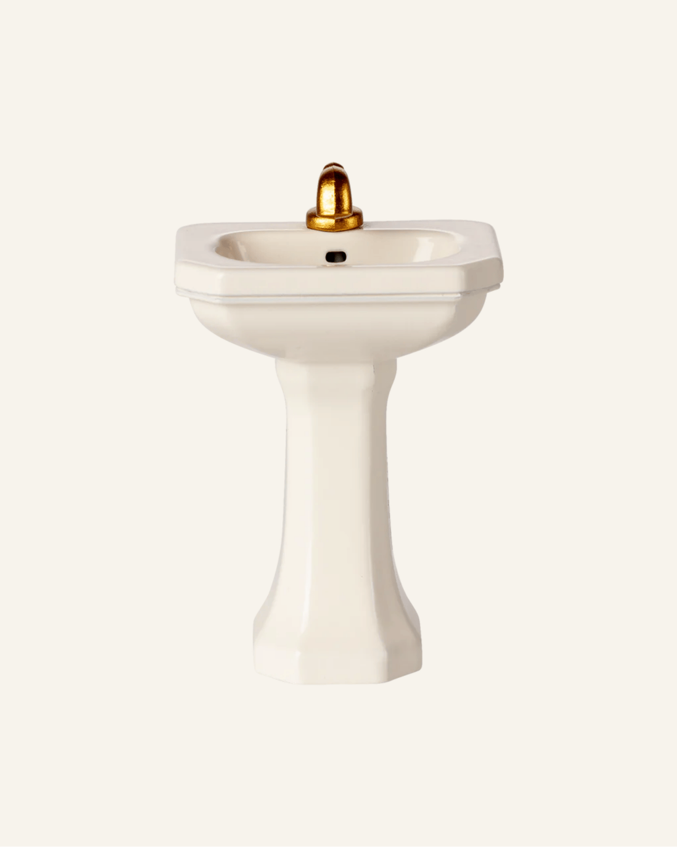 this small maileg bathroom sink fits the little sister/brother mice just right. complete with adorable gold holdware detail. fits perfectly into the bathroom in the SuitCasa mouse house.