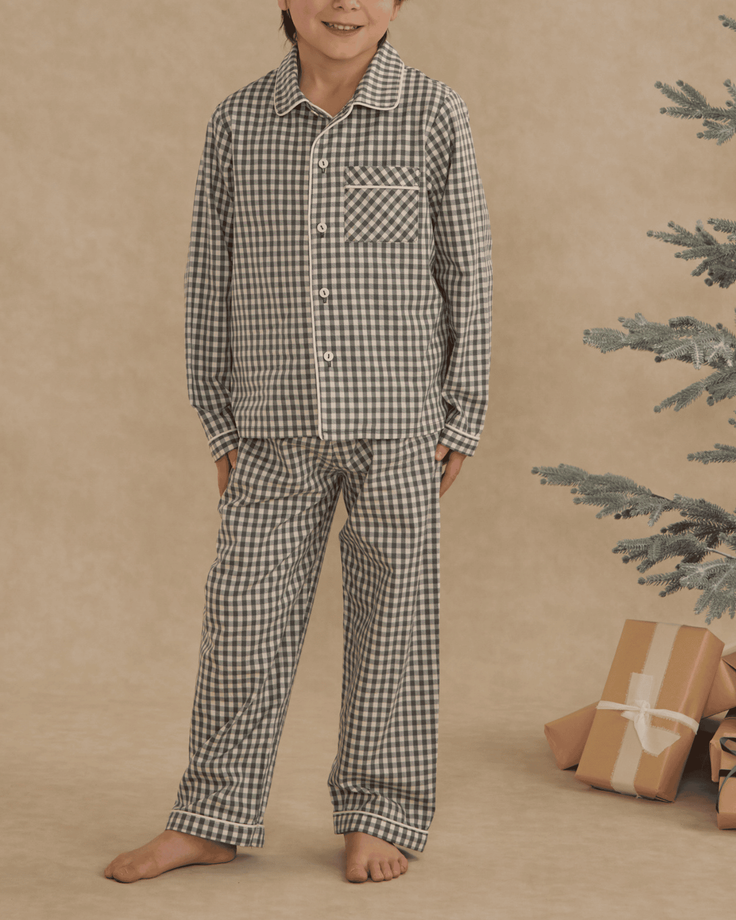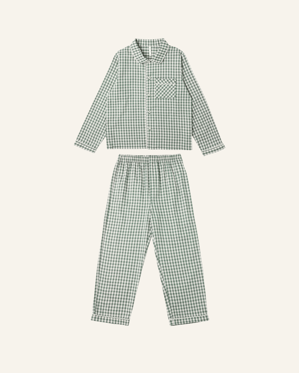 these long sleeve pajamas by rylee + cru are the perfect little boy pjs for the holiday season. the top has a pocket at the front, buttons down the center, and an elastic waistband for the perfect fit. the festive green gingham print is sure to be a hit for all your holiday celebrations.