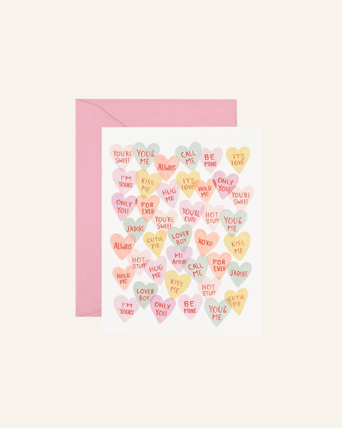 the valentine sweetheart card by rifle paper co. is the perfect way to write a heartfelt note to your loved one. featuring illustrations of classic conversation hearts in soft pastel tones. complete with a blank interior, letting your handwritten note take center stage. comes with a pink envelope.