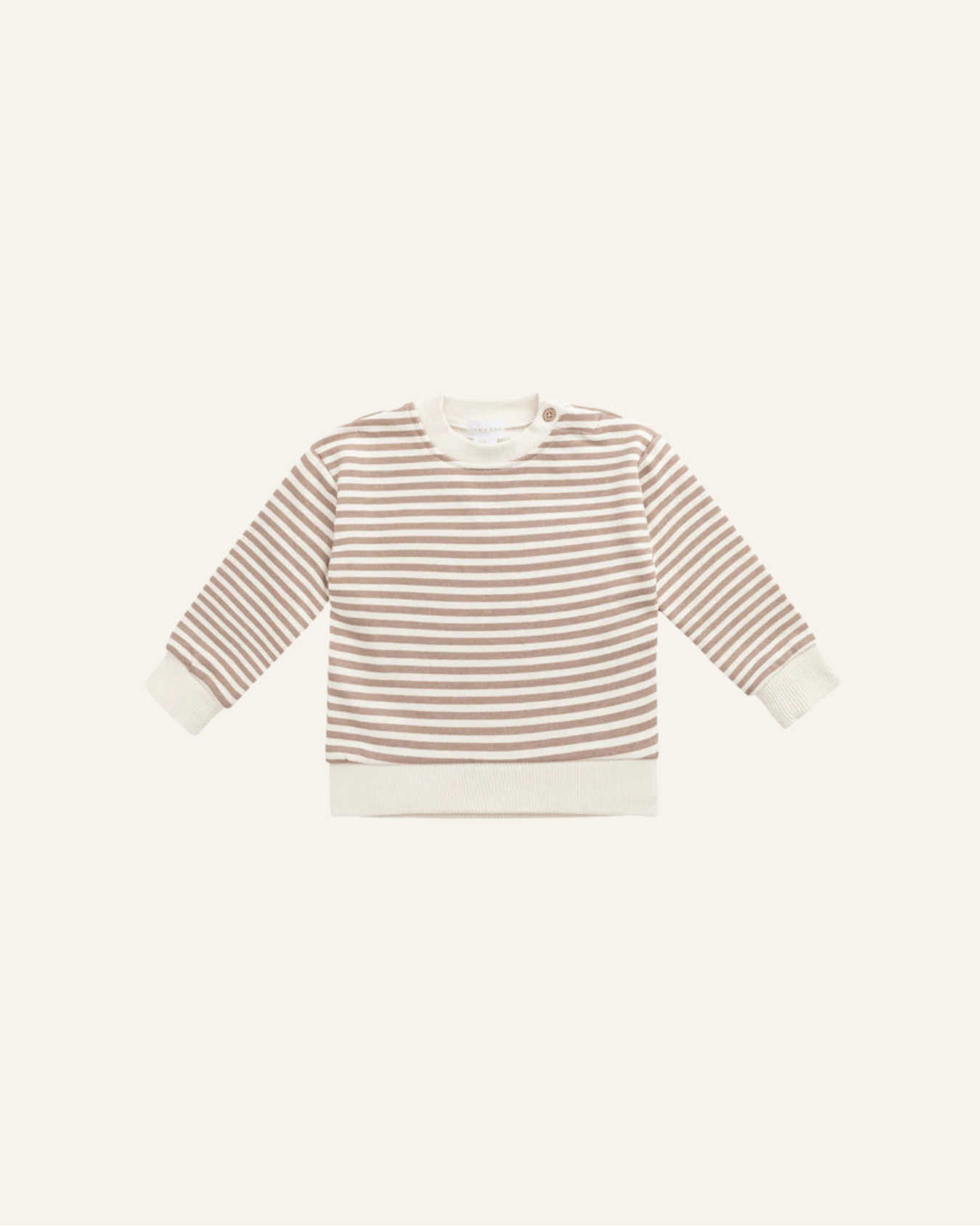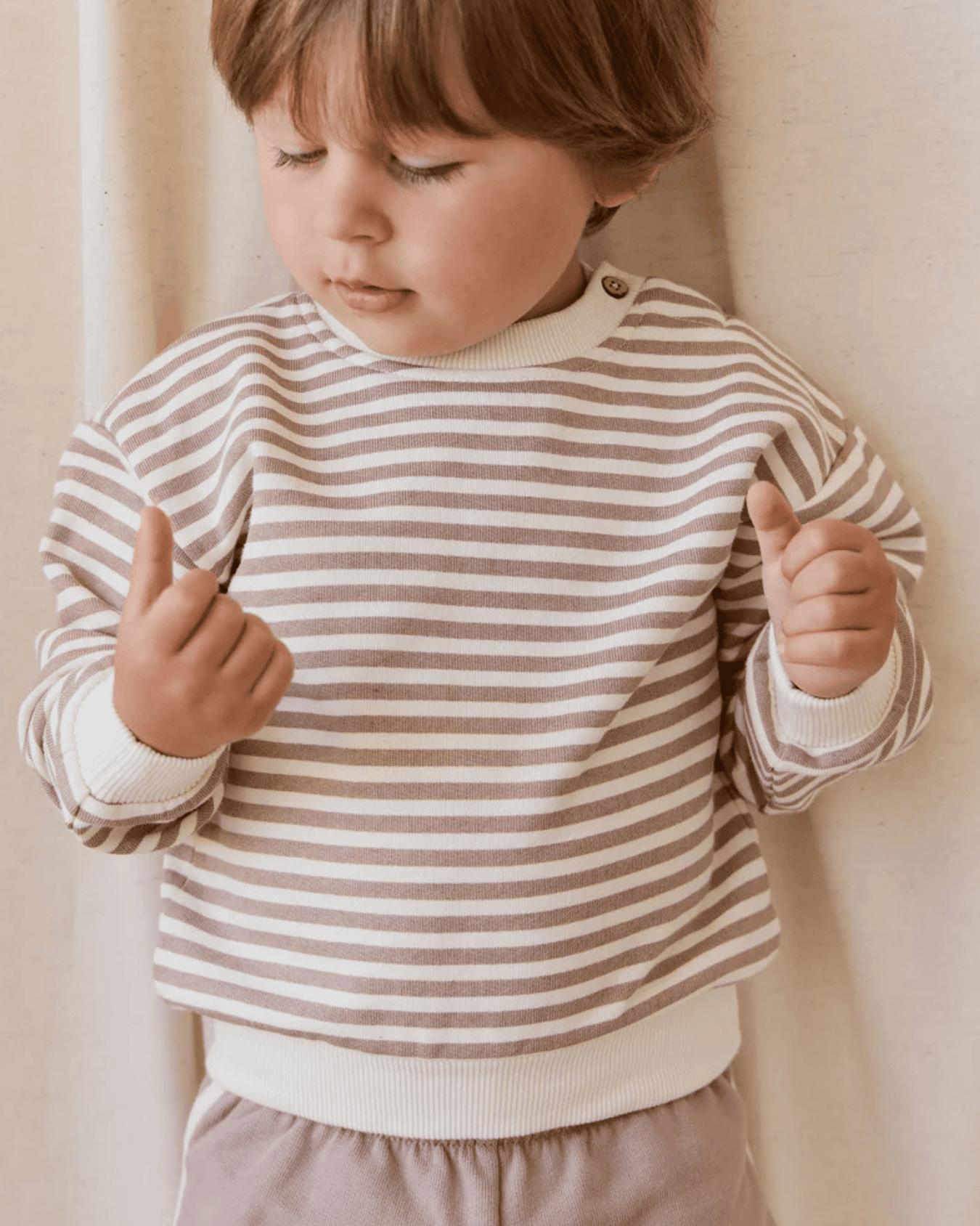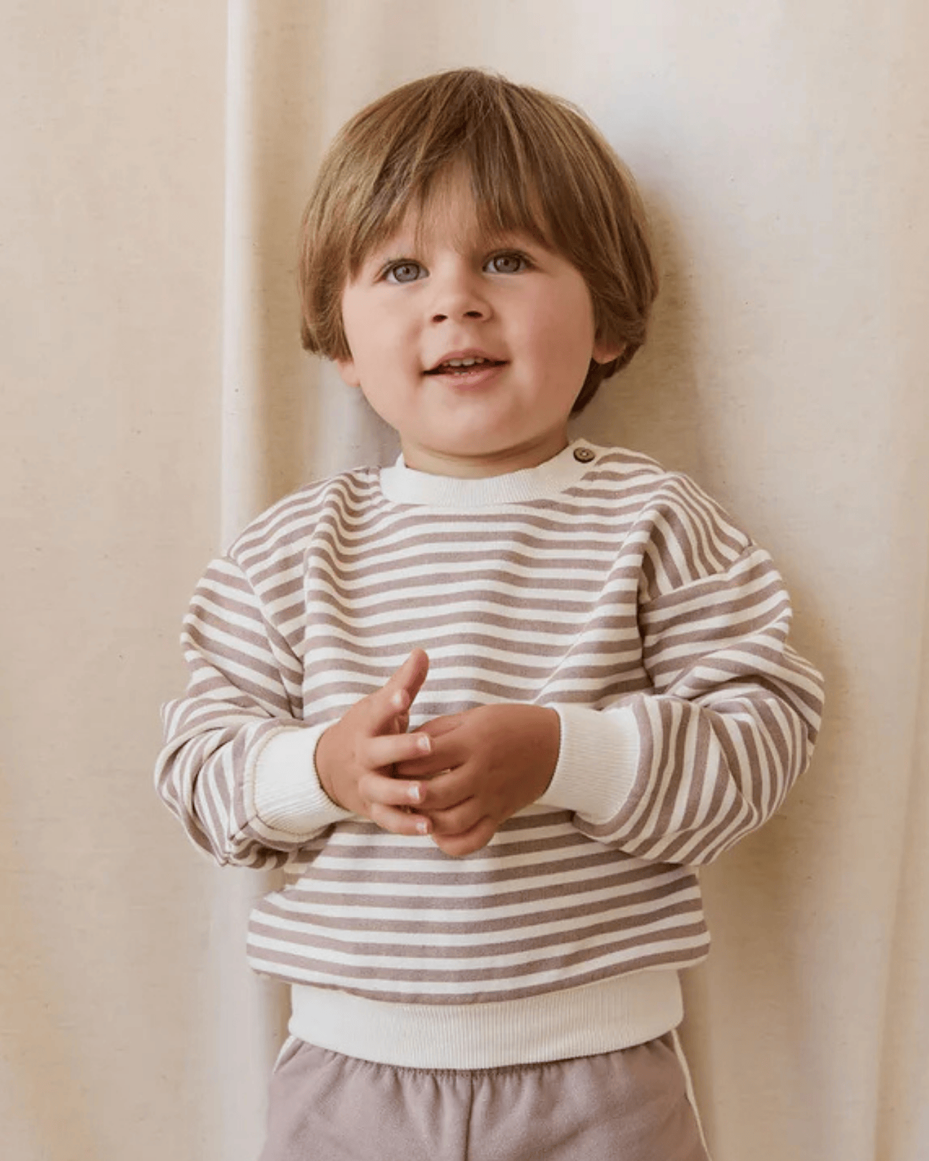 from the jamie kay bonjour cherie collection, the organic cotton peyton sweatshirt is stylish + cozy. features a classic stripe pattern + is sure to keep your little one comfy while they play all day. complete with a functioning button at the top shoulder for easy dressing.