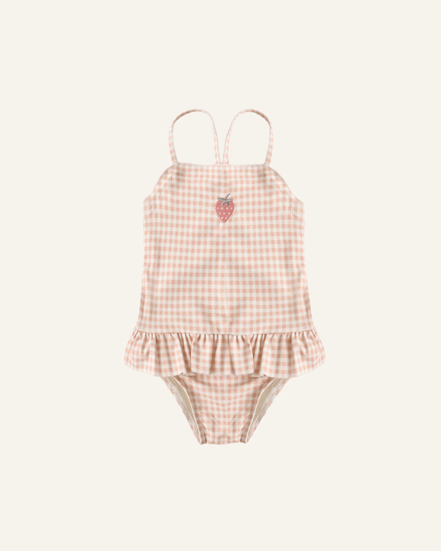 the tori one-piece swimsuit by rylee + cru is designed with a ruffle along the neckline + straps that come together in the back. the dainty gingham print is extra fun for spring + summer. made from upf 50+ material, this swimsuit is perfect for your little girl.