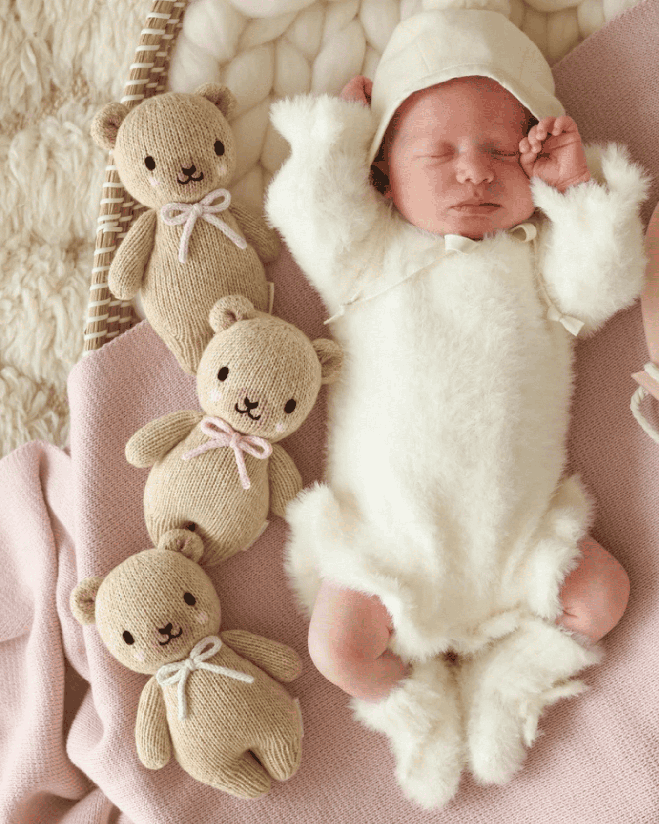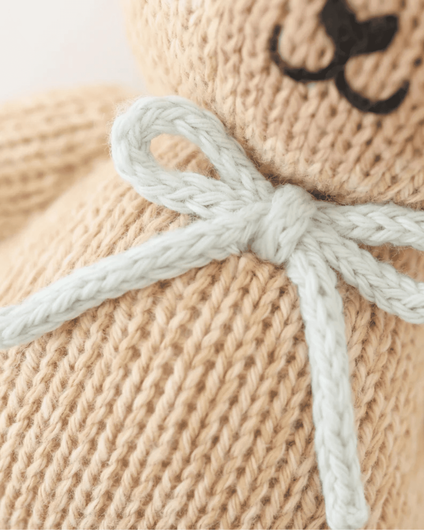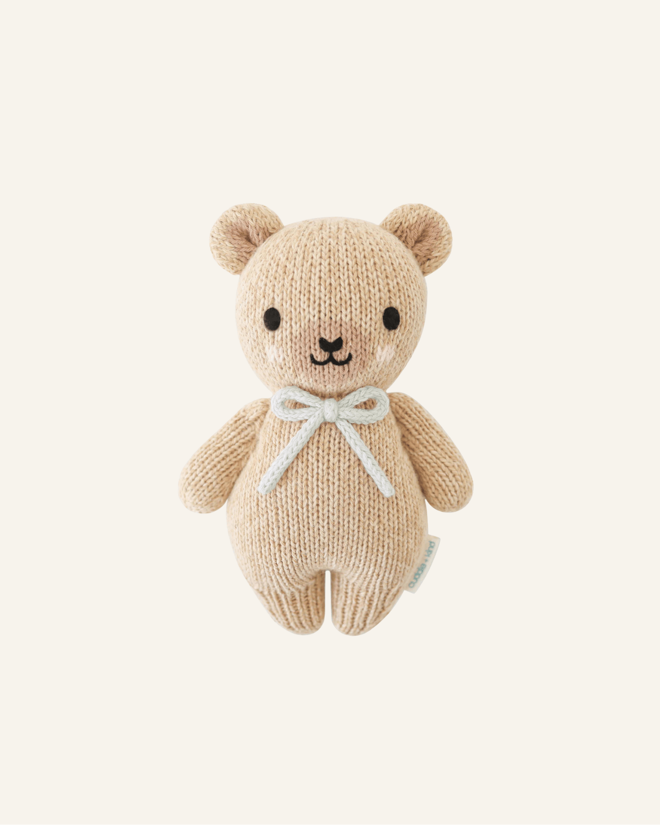 this sweet hand-knit baby honey bear by cuddle + kind is an heirloom-quality baby animal, lovingly handcrafted from natural peruvian cotton yarn.  this baby knit bear is just a little bigger than your hand + makes the softest, most lovable stuffed animal for little ones. every baby animal is handmade and will vary slightly, making it truly one-of-a-kind.
