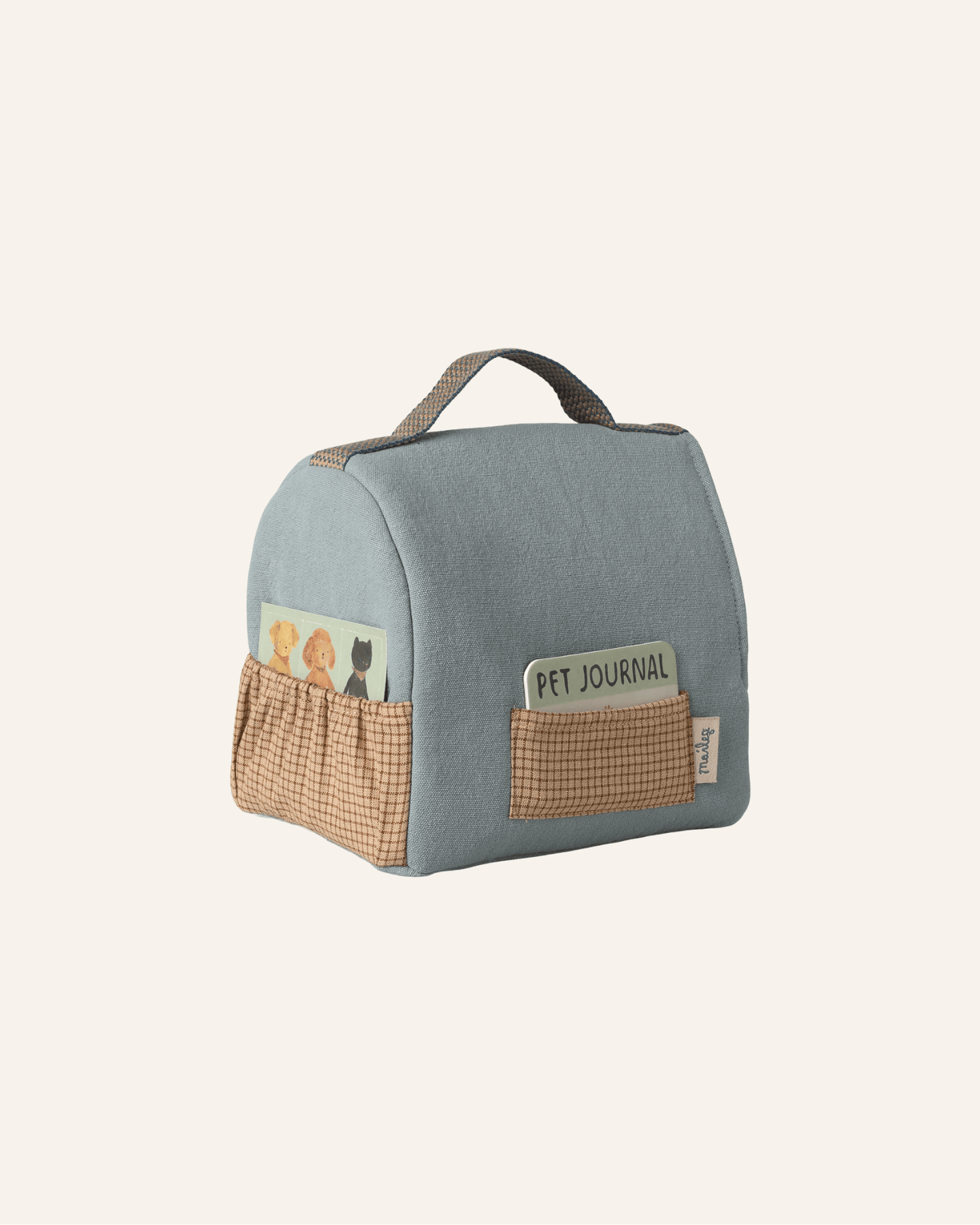 extend the story + playscene for your soft puppy with this maileg pet carrier. this carrier is made to carry your friend all around very easily. it includes a pet ID so it is easy to see who the carrier belongs to.