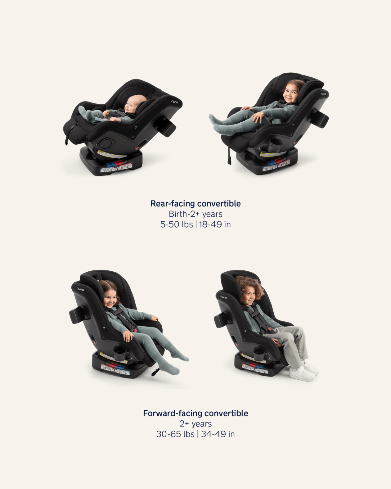 • convertible car seat designed for longevity from birth to big kid easily adapting from rear to forward-facing modes