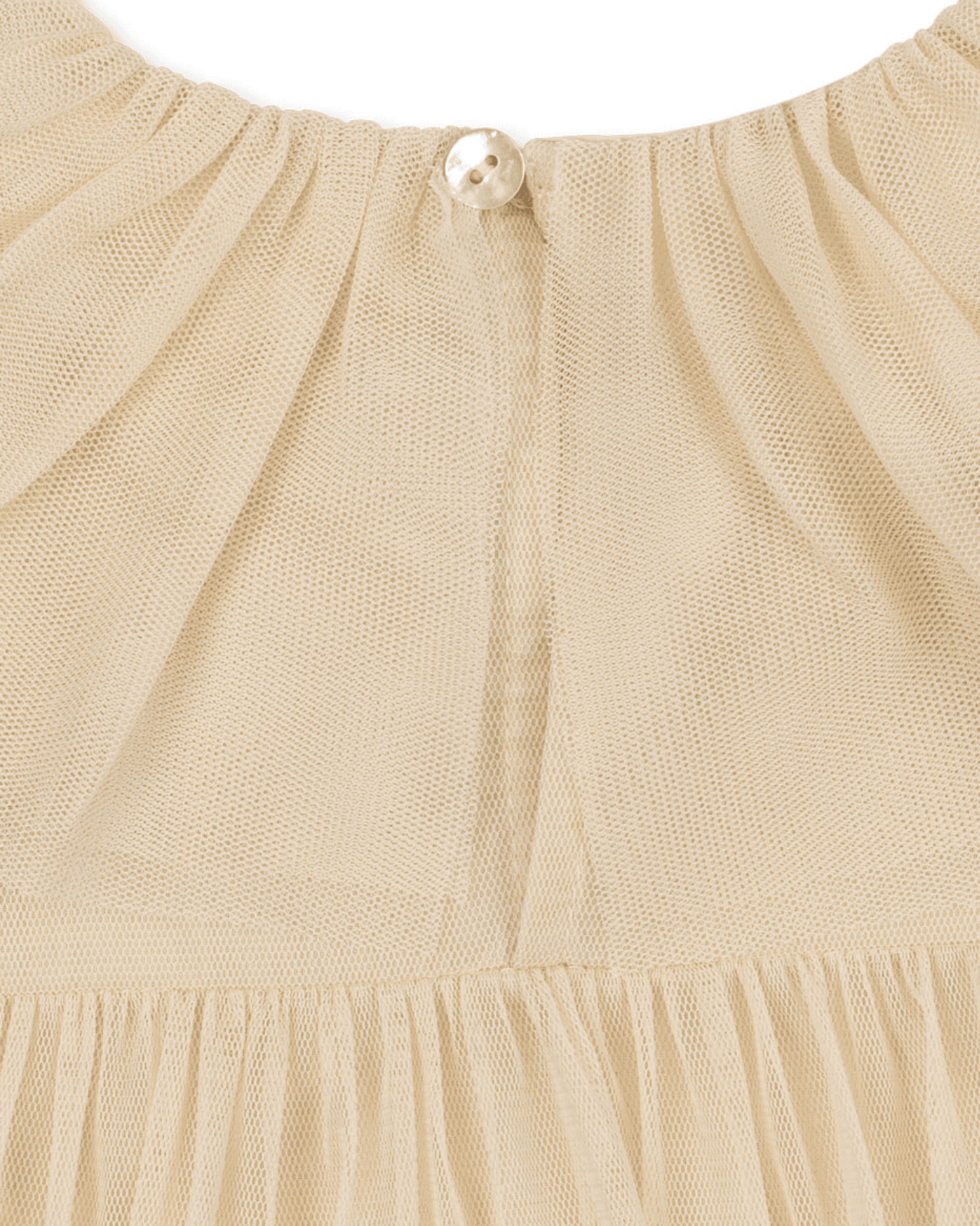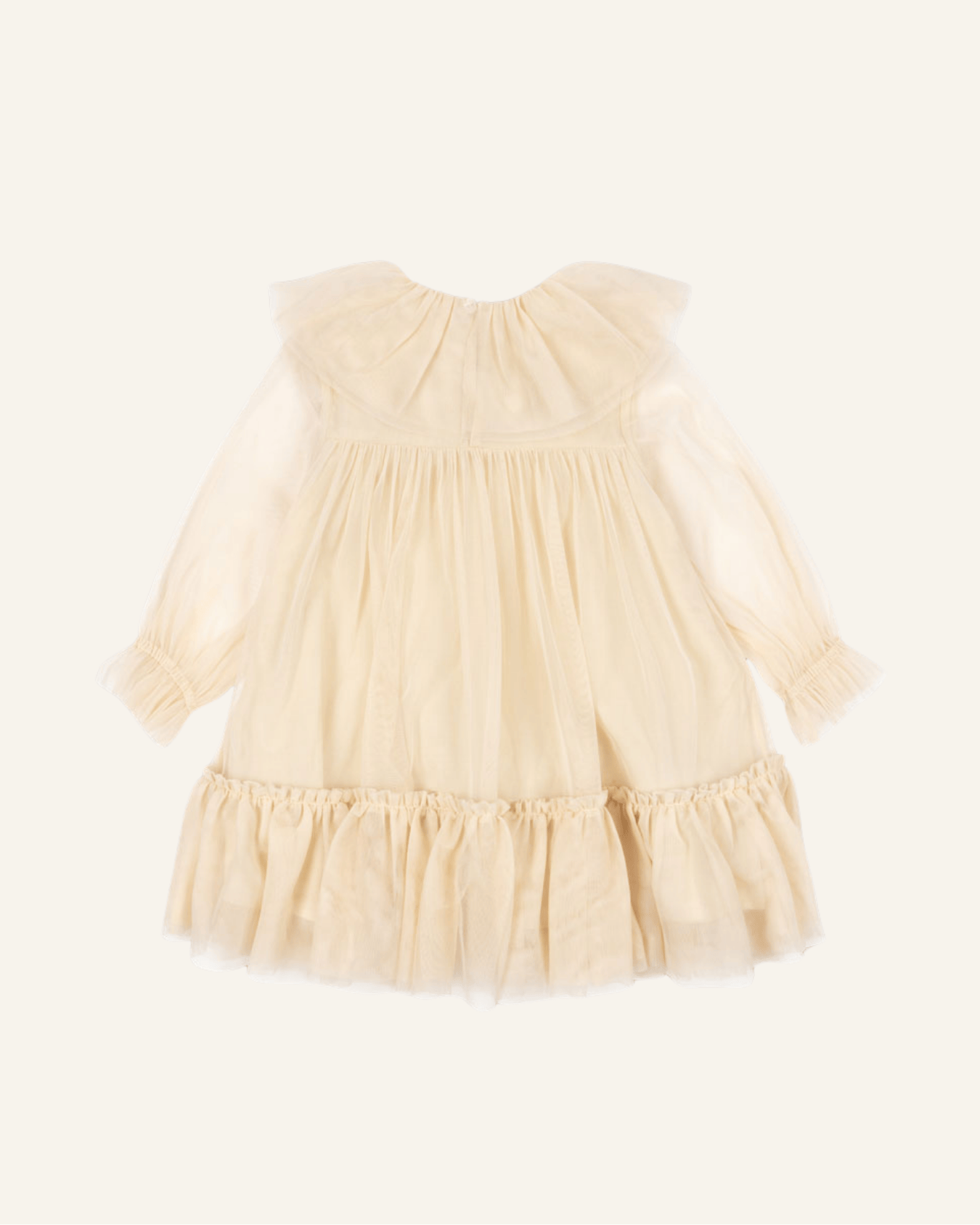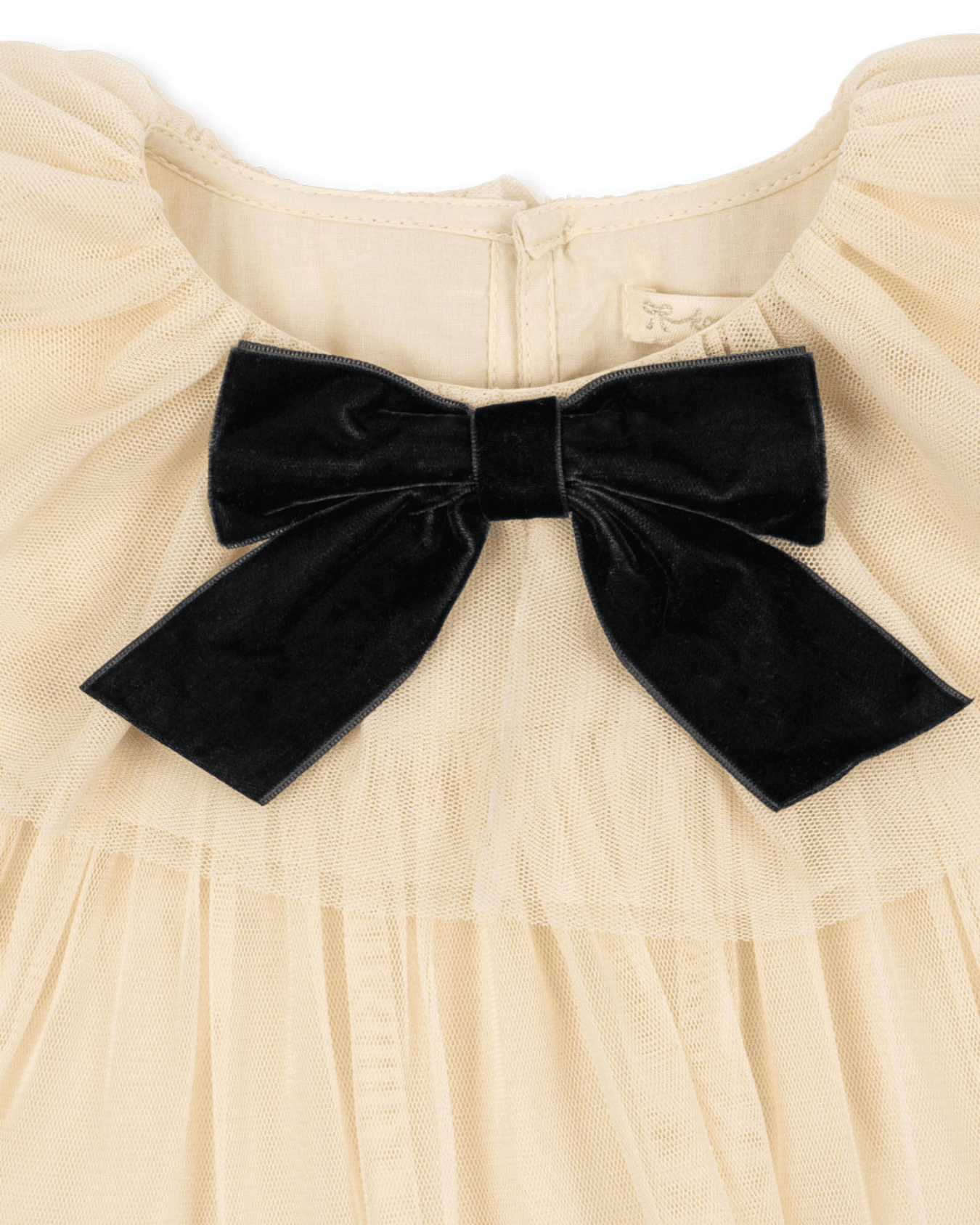 the konges slojd bow dress is perfect for your little girl this holiday season. this soft tulle dress has a festive collar detailing + a decorative bow in front. designed with a long, loose fit that is comfortable to wear + a soft cotton lining. perfect for holiday parties + photos.
