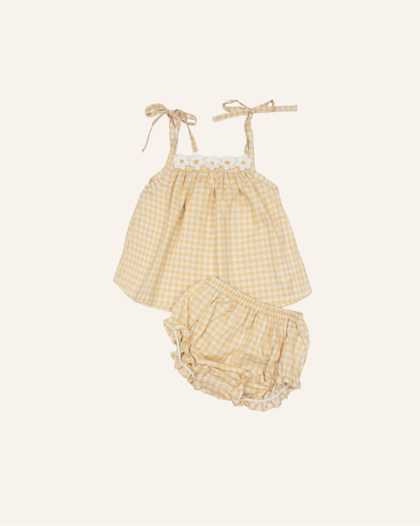 the crochet daisy set by wild wawa is an adorable top + bloomer set in a creamy yellow gingham print. this is the perfect set for warm weather. the soft pima cotton is perfect for sensitive skin. the top features a row of adorable hand-crochet daisies + cute tie straps with bows at the shoulder.