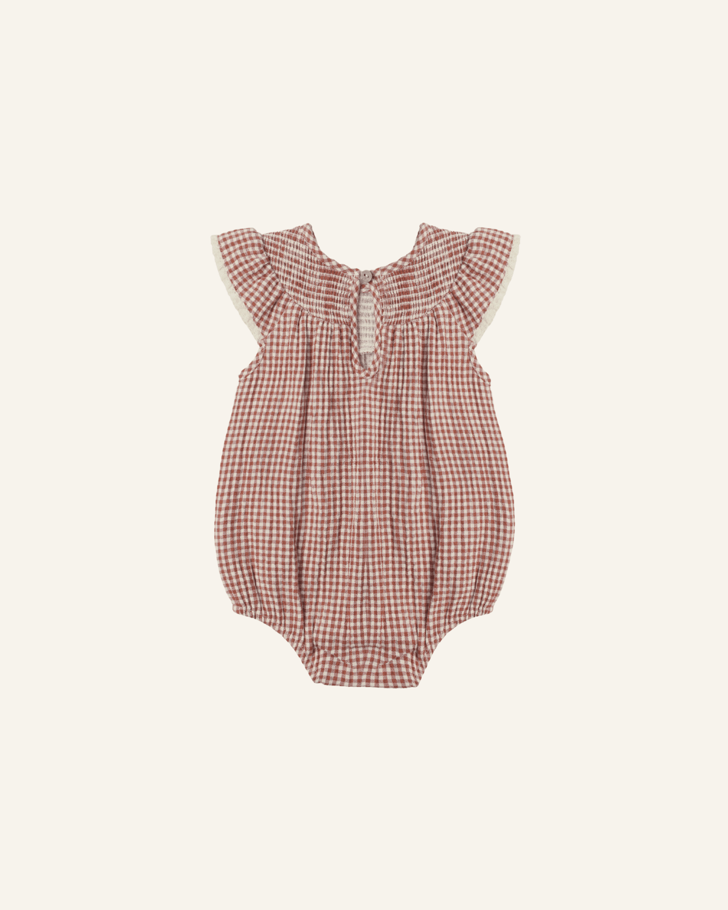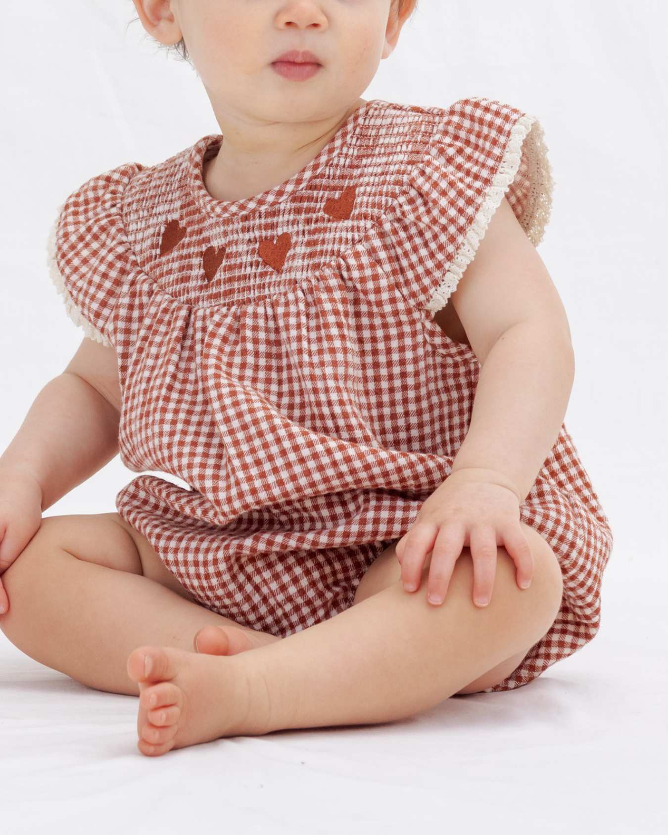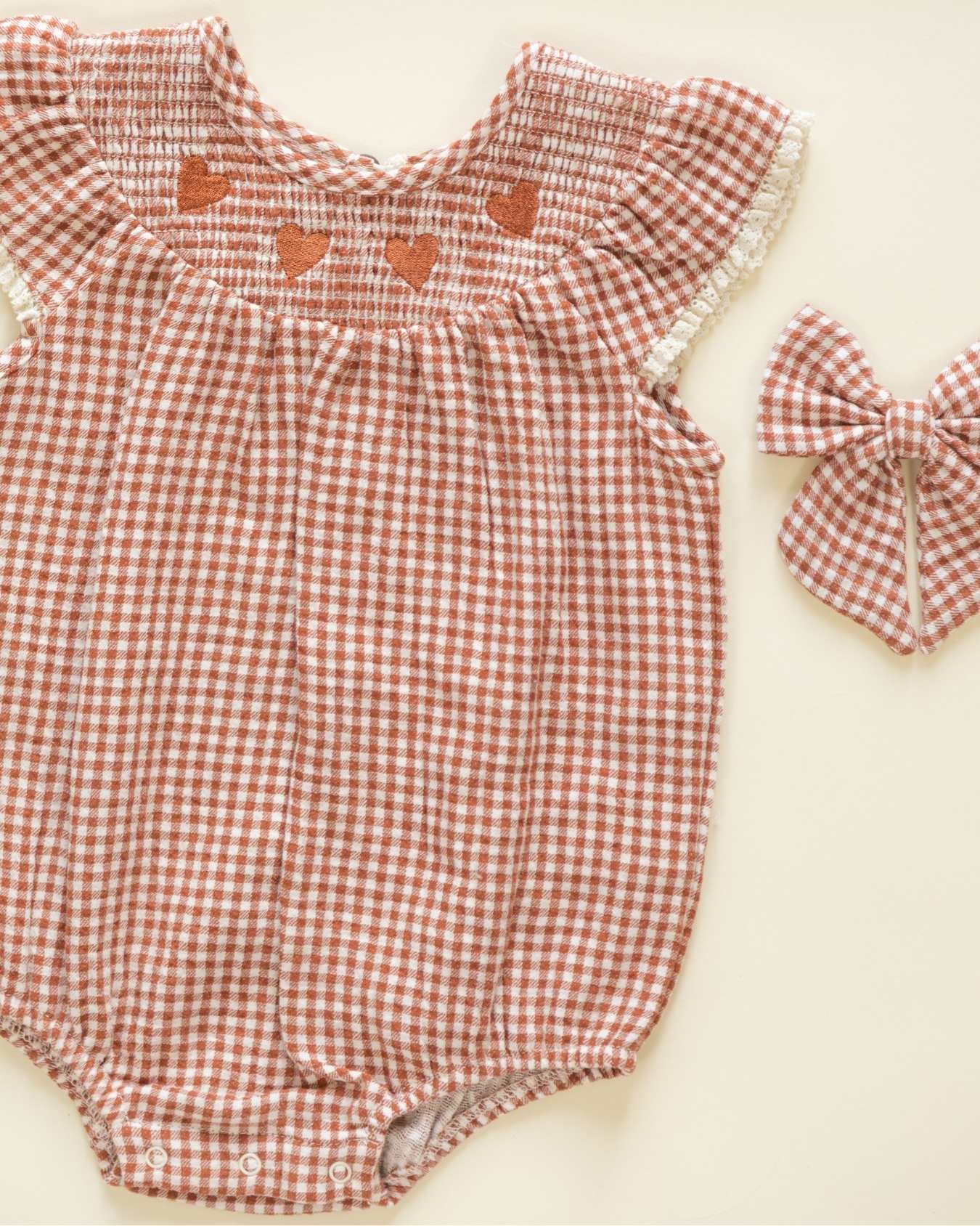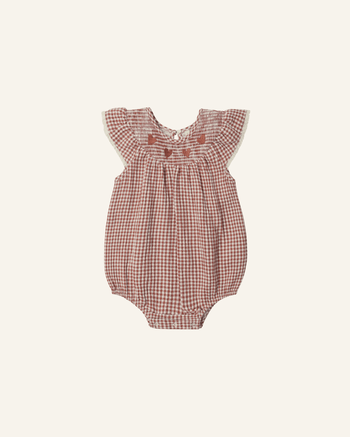 the lenore romper by quincy mae in an adorable red gingham print, perfect for valentine's day. this adorable romper features ruffle sleeves with crochet lace trim + a smocked neckline with red embroidered hearts. the button at back neck, elastic leg openings + bottom snap closures make for easy changes + a perfect fit.