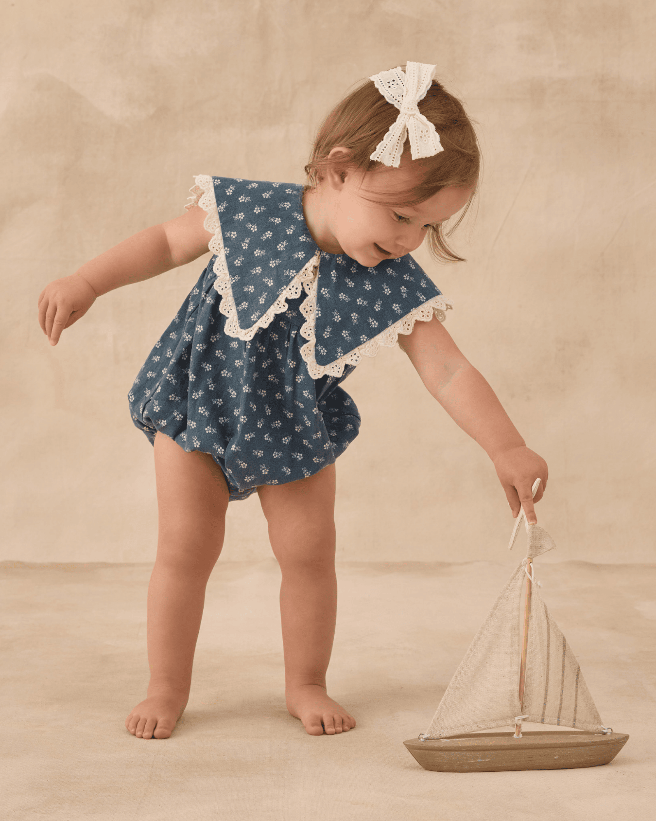 the porter romper by rylee + cru is the most adorable baby girl romper for spring + summer. featuring an oversized sailor v collar + elastic leg openings, it's perfect for playtime. we love the ditsy floral print on the beautiful blue background.