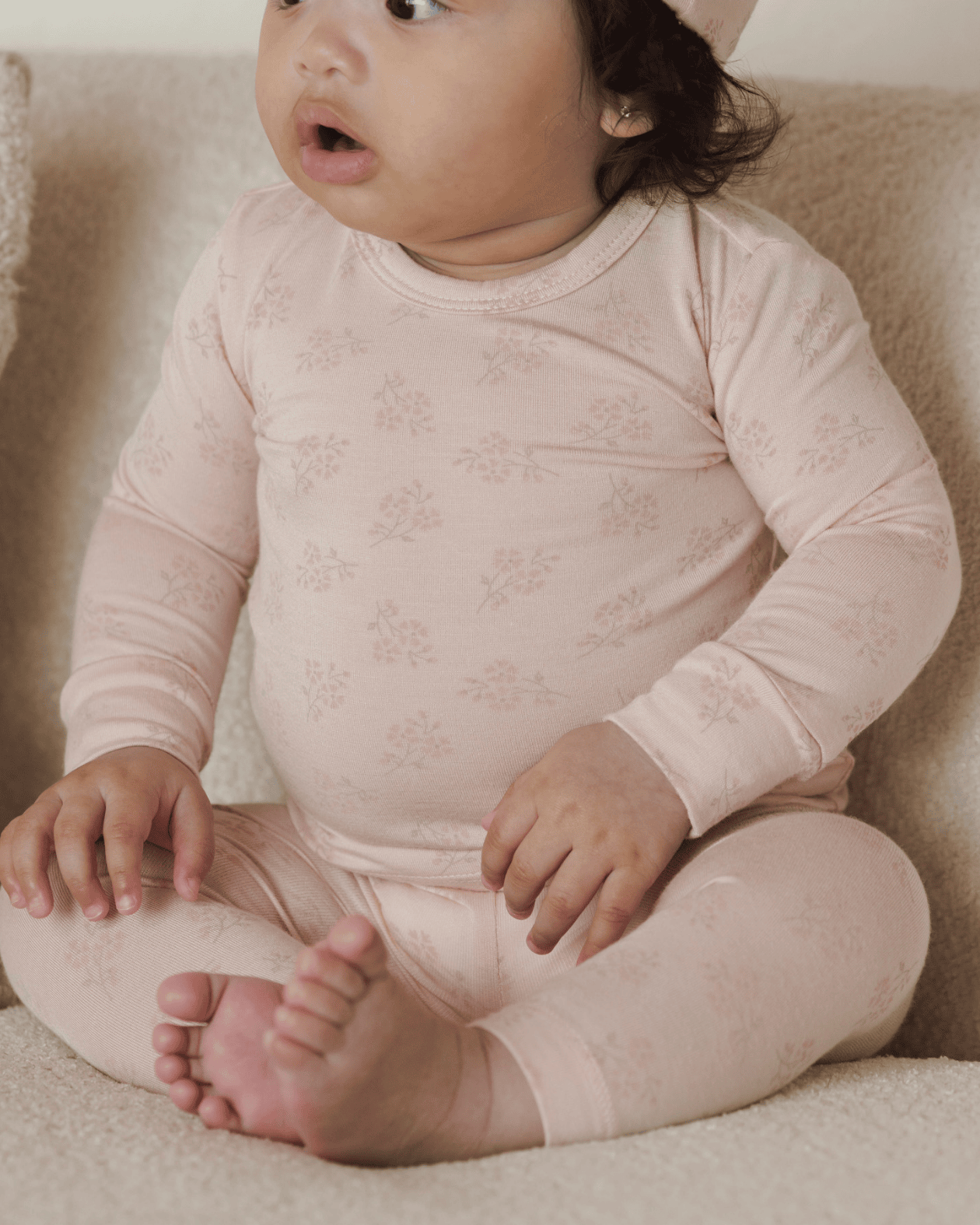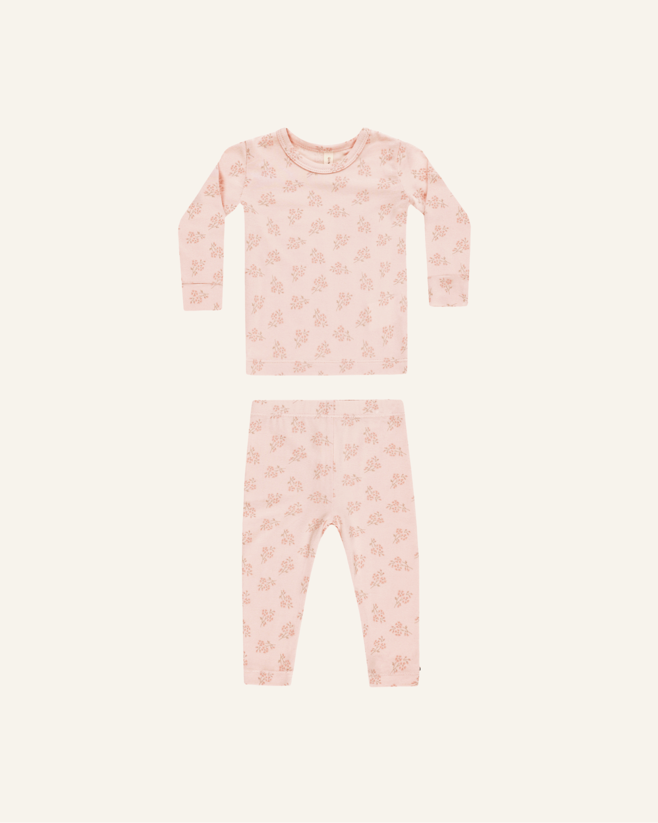 the sweetest pajama set by quincy mae with a slim, stretchy fit.  tee has long sleeves + pants have an elastic waist. both are made in ultra soft fabric for the most comfortable sleep or play.