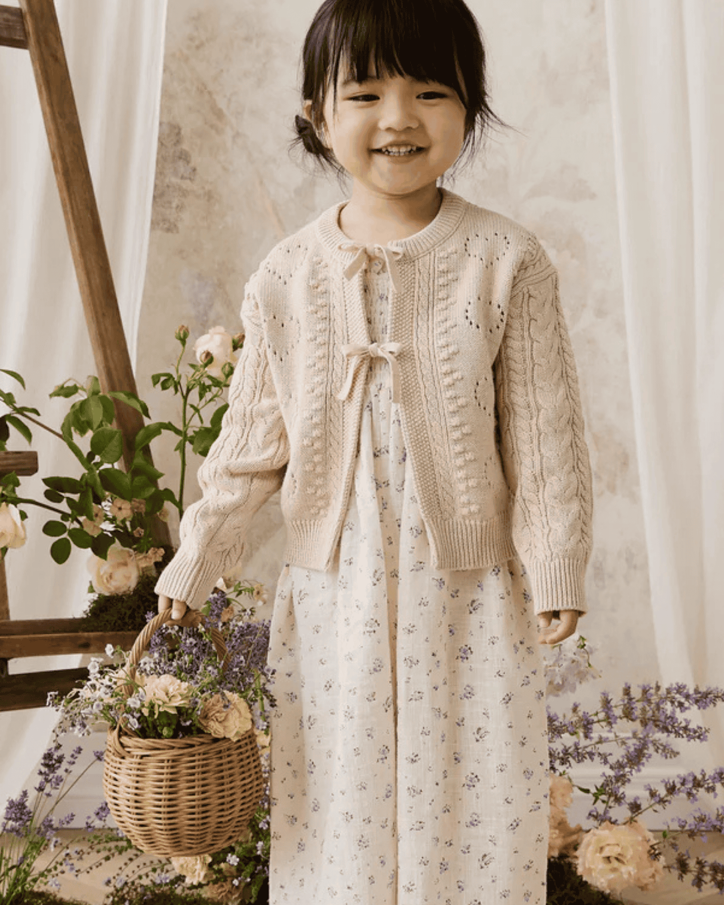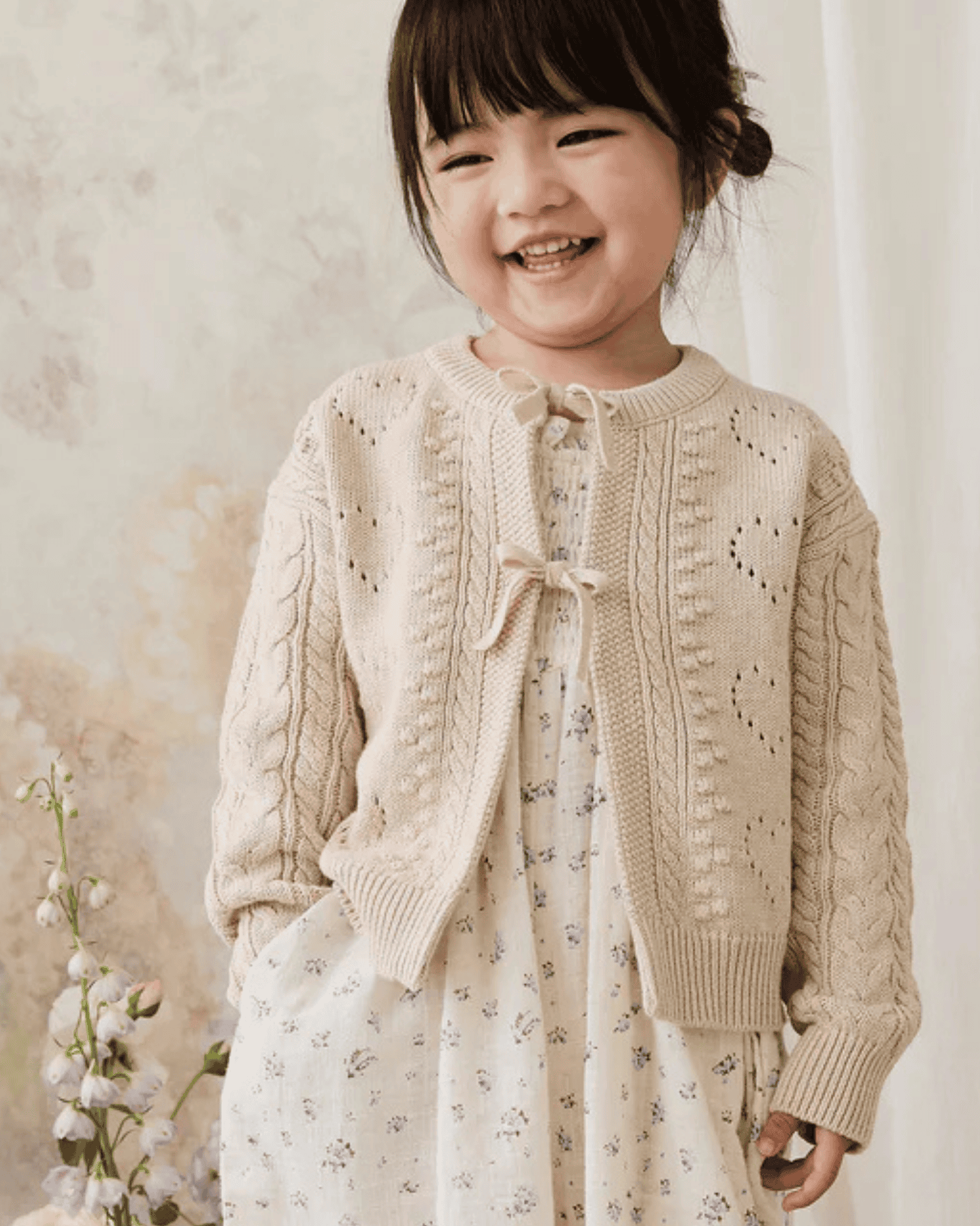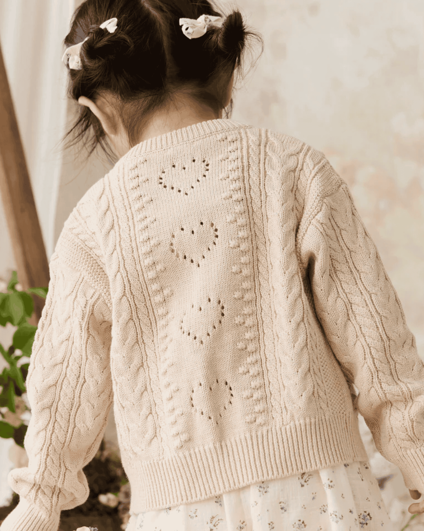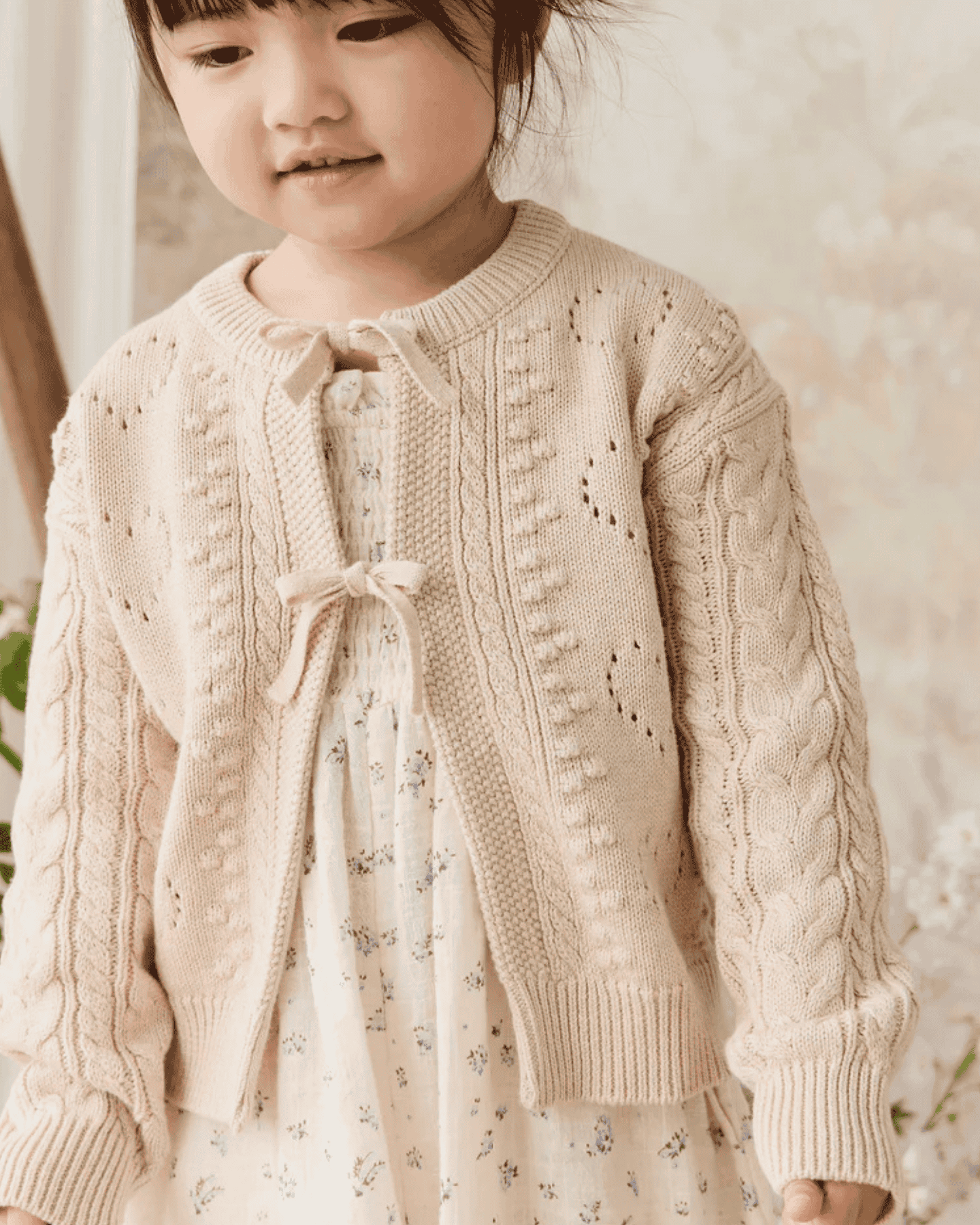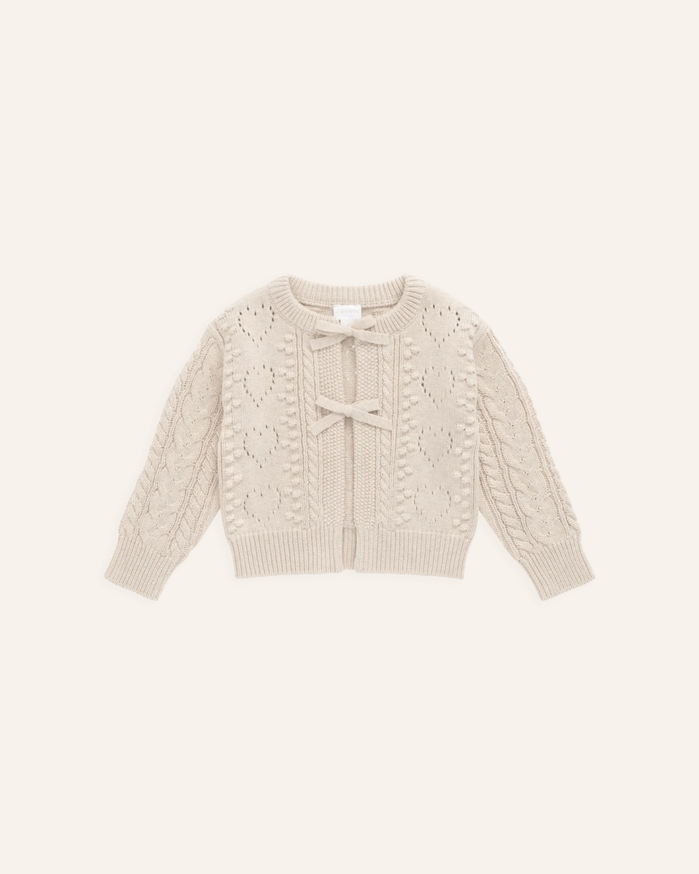 wrap your little one in timeless elegance with the josephine cardigan by jamie kay. features a delicate cable knit detailing with dainty bow accents in a beautiful oatmeal color. this piece is perfect for layering + adding a touch of vintage charm to any outfit.