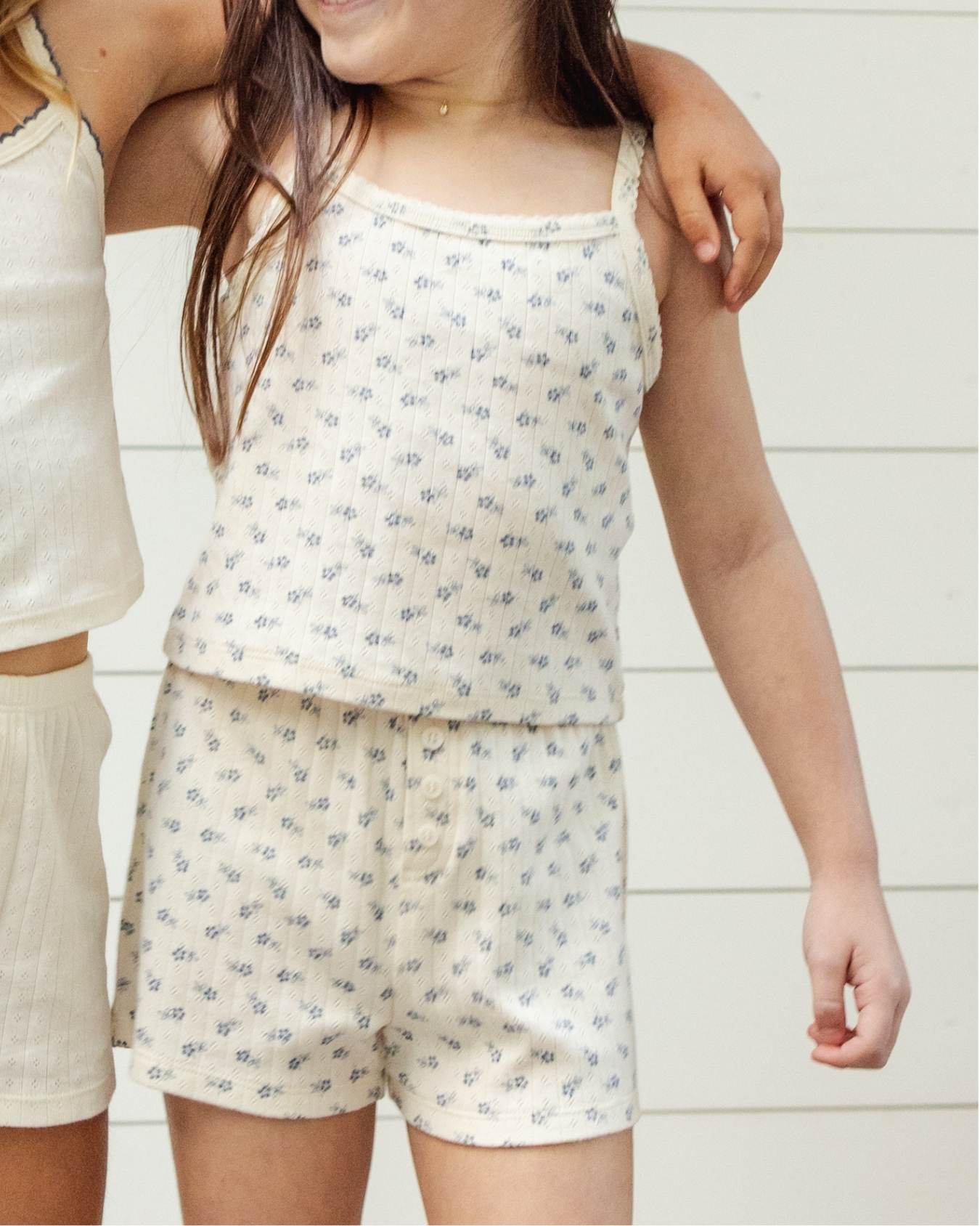 the pointelle lounge set by rylee + cru features scalloped stitch detail on the straps + neckline for a sweet finish. the shorts feature a comfy elastic waistband + the top has an adorable little bow detail - this set is perfect for lounging in the warmer months.