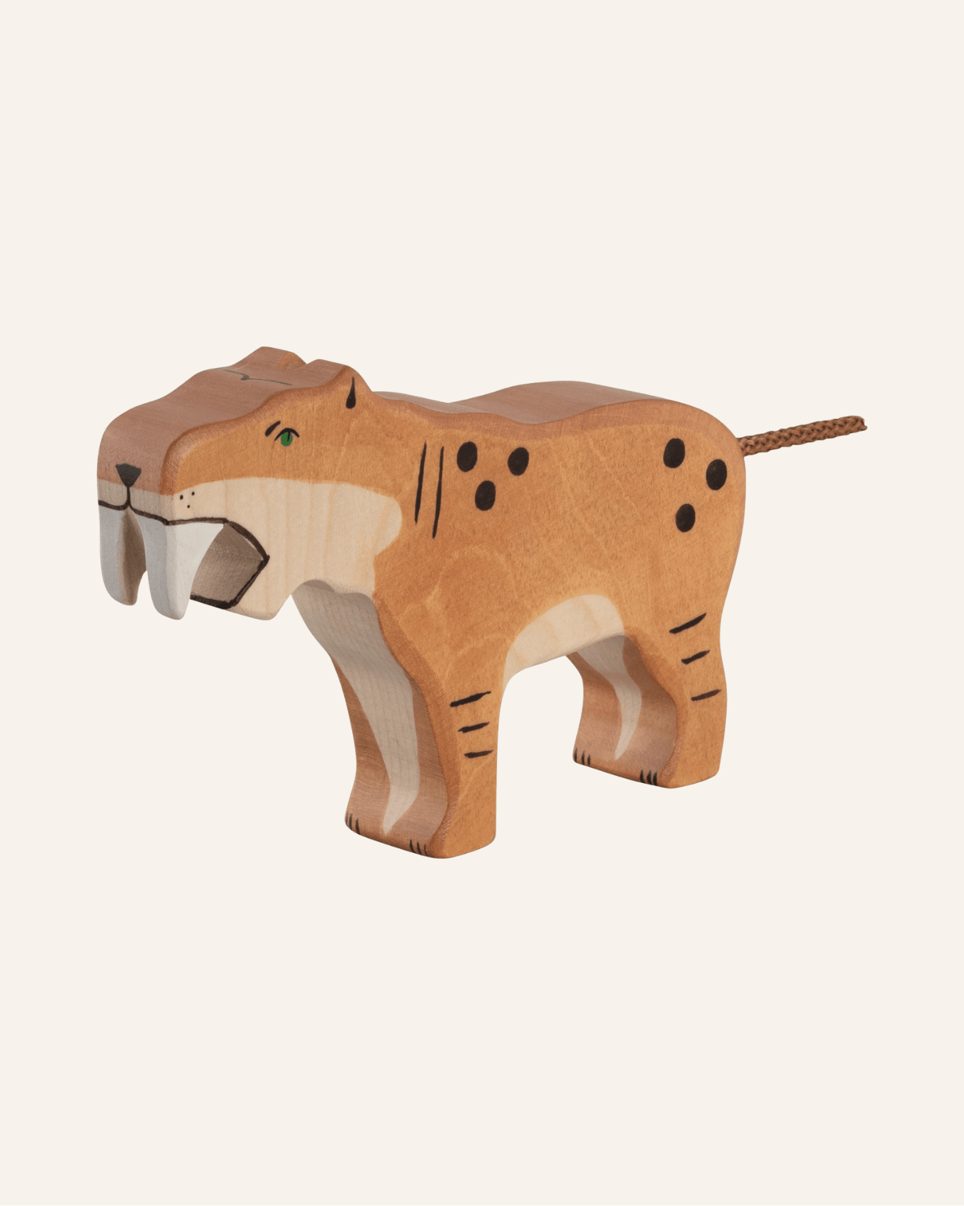 this wooden saber-tooth tiger toy is a handcrafted HOLZTIGER figurine produced by the world-renowned toy company goki. individually handcrafted from maple + beech wood, this wooden tiger is painted using watercolors, giving it a soft color palette perfect for any playroom. let your child engage in endless pretend play with this fun wooden animal toy.