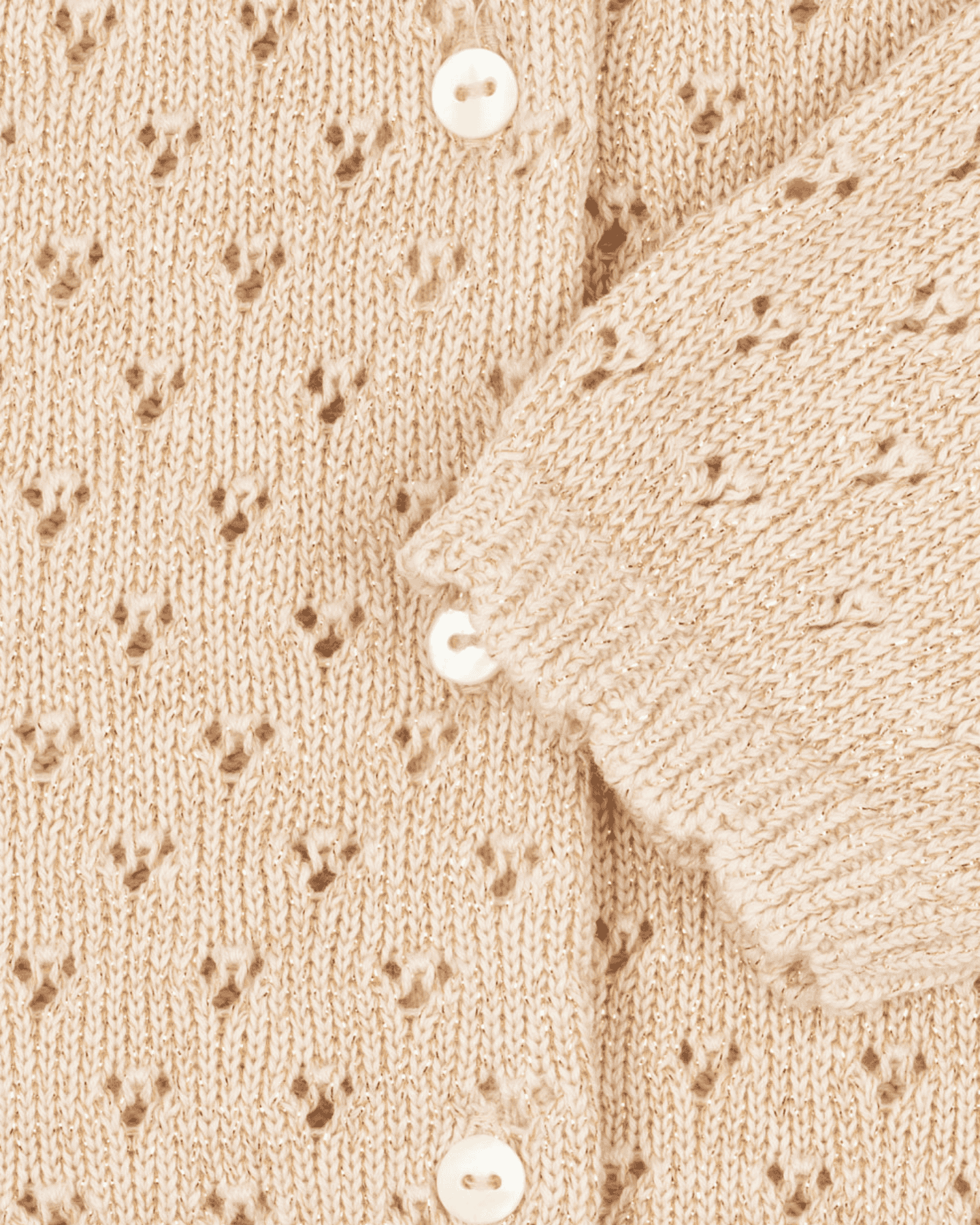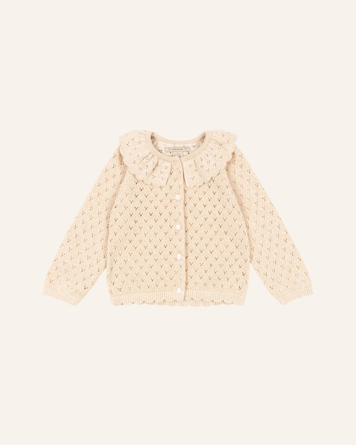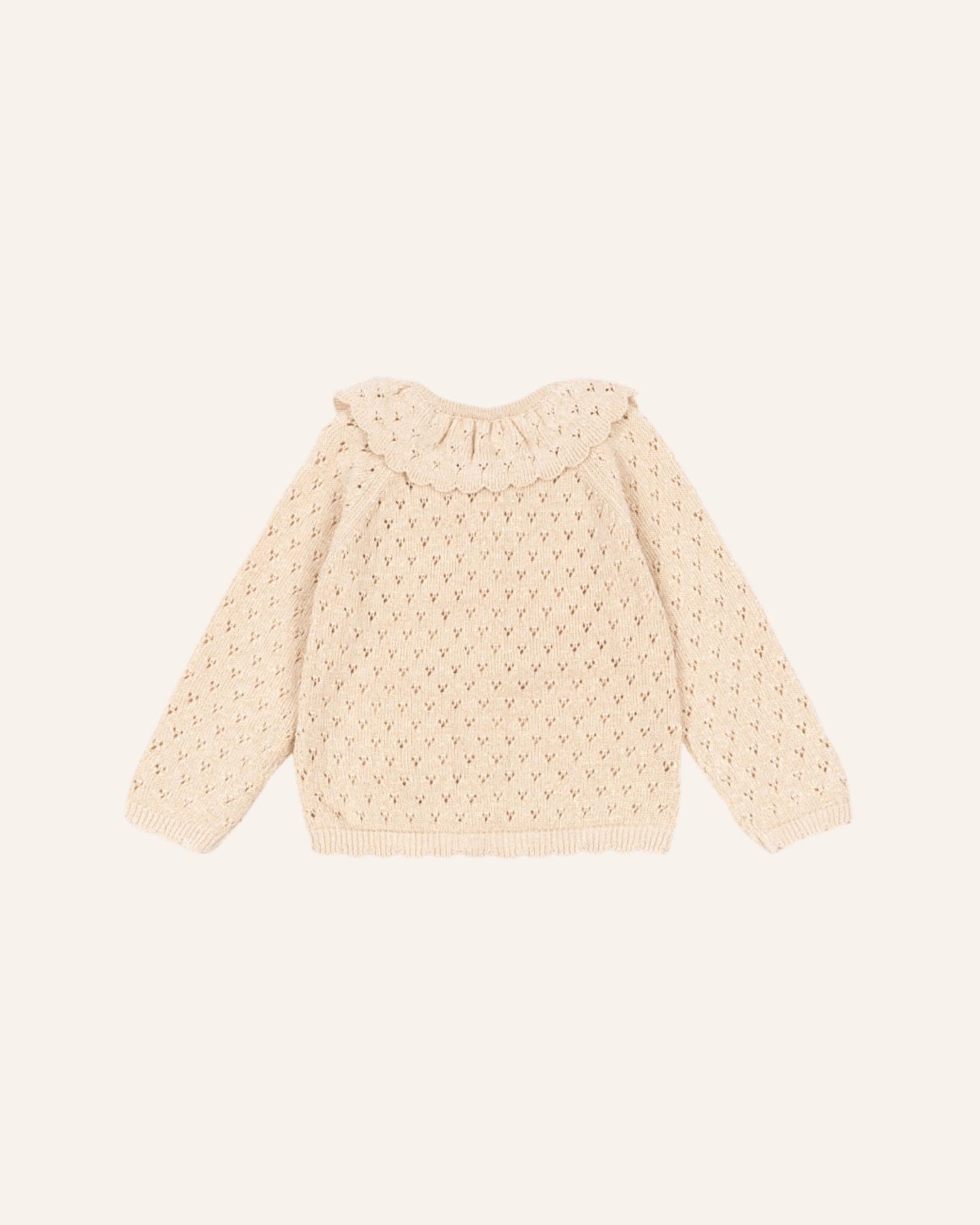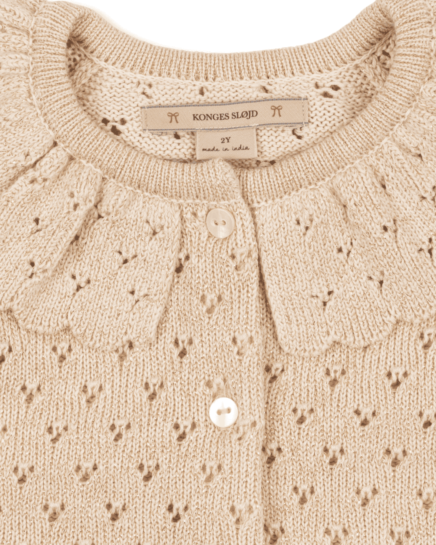 this adorable knit cardigan by konges slojd is perfect for the holiday season. featuring a rounded collar + a delicate eyelet knit pattern, this cardigan layers so nicely with holiday dresses or tops. sweet scalloped detail along the wrist cuffs + bottom hem add a special touch to this knit cardigan.