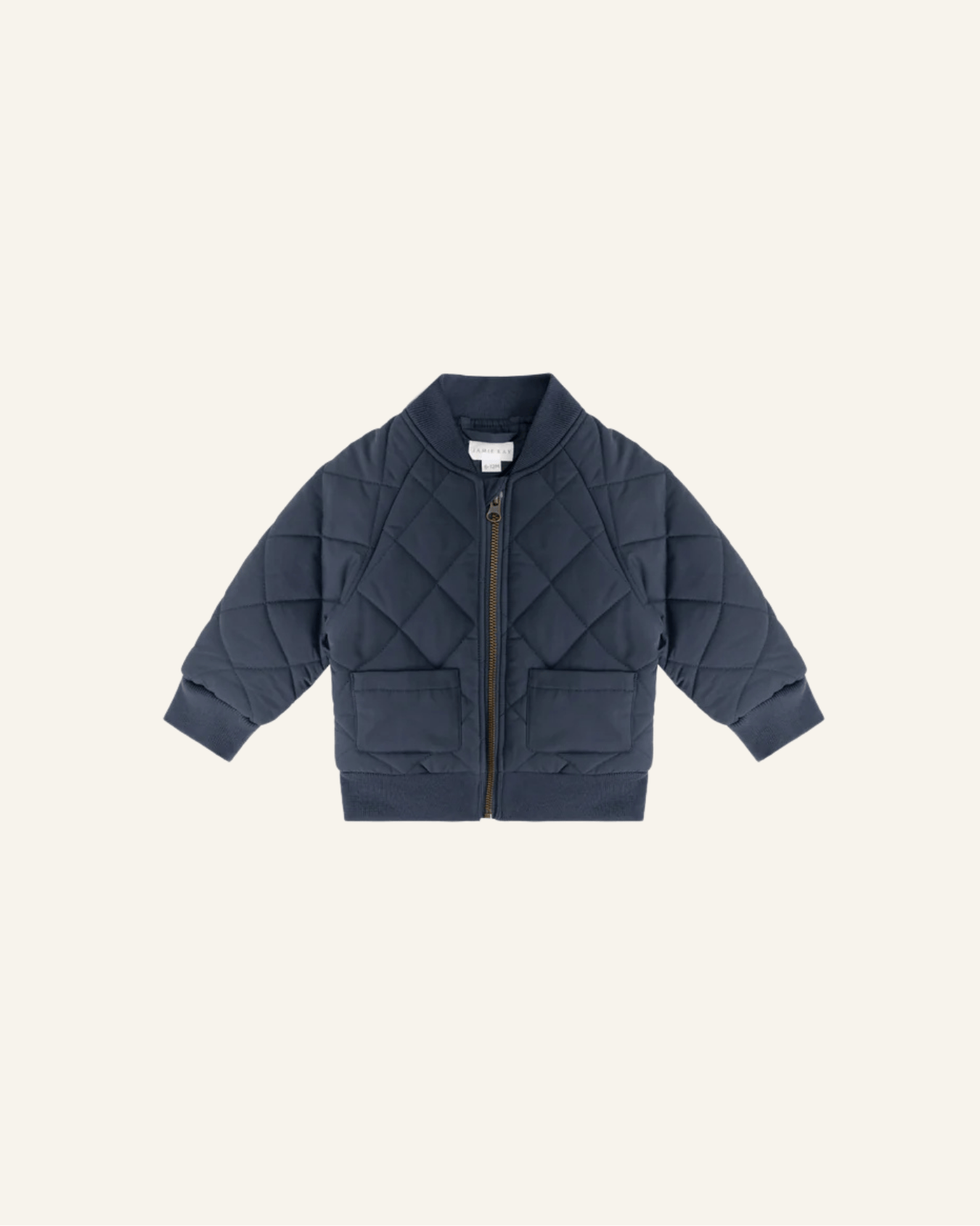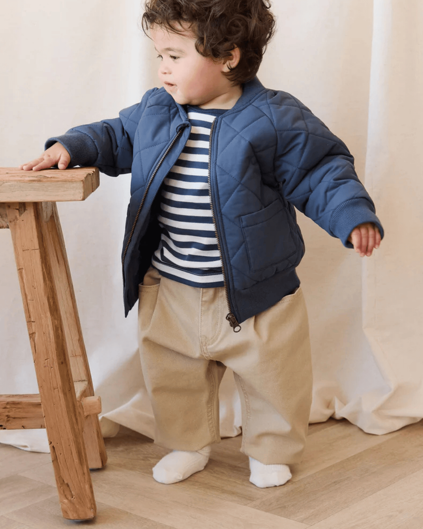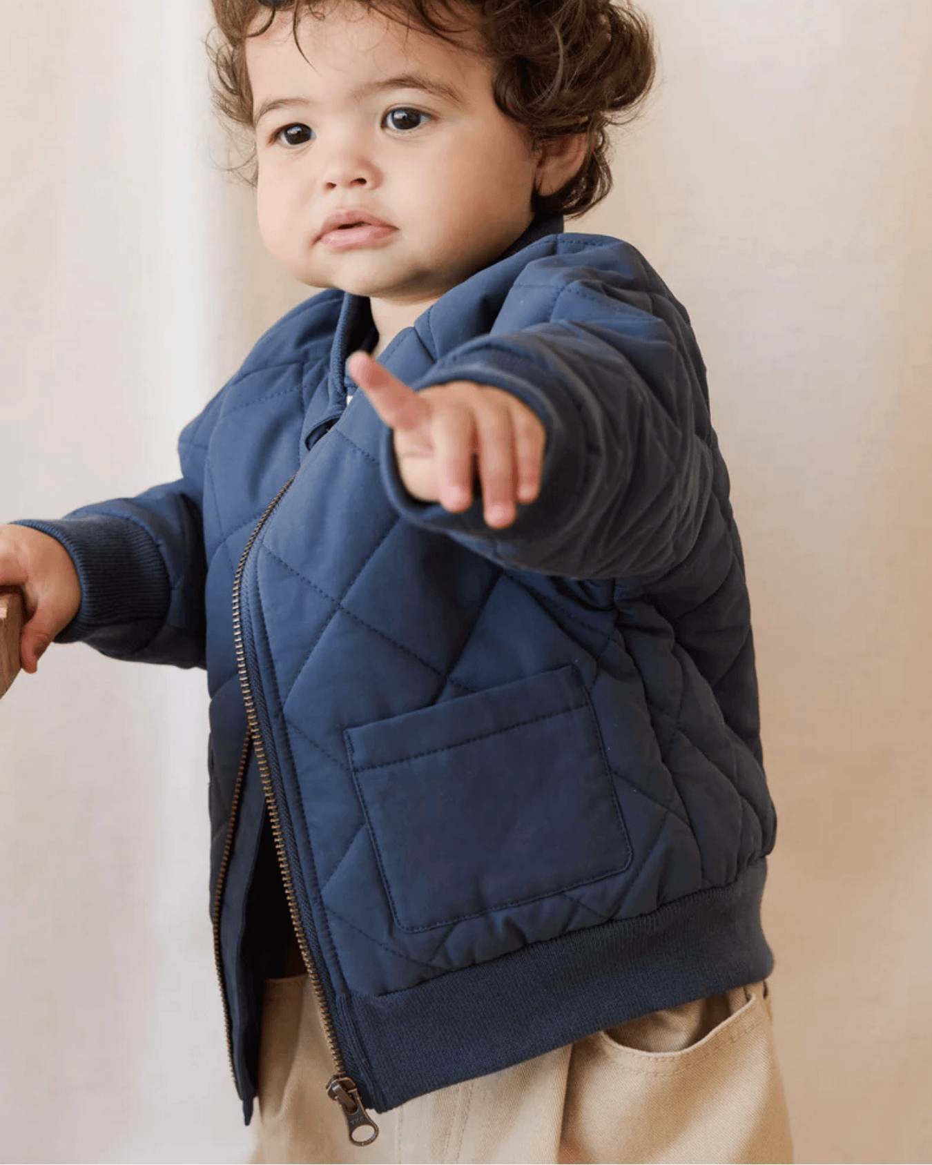 the cammy jacket by jamie kay is the perfect transitional jacket for fall. the slightly oversized look is both stylish + comfy for your little. features a metal zipper + functional pockets to keep those little hands warm.