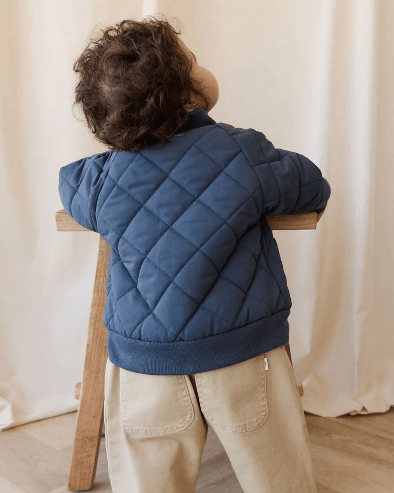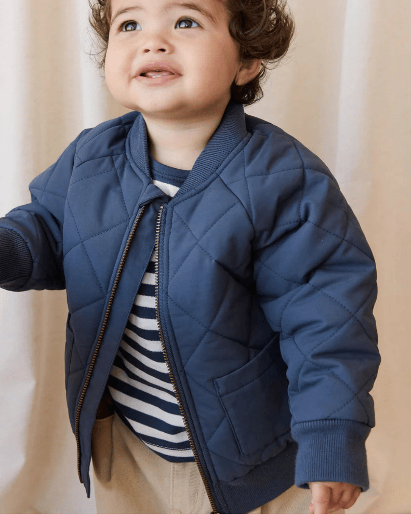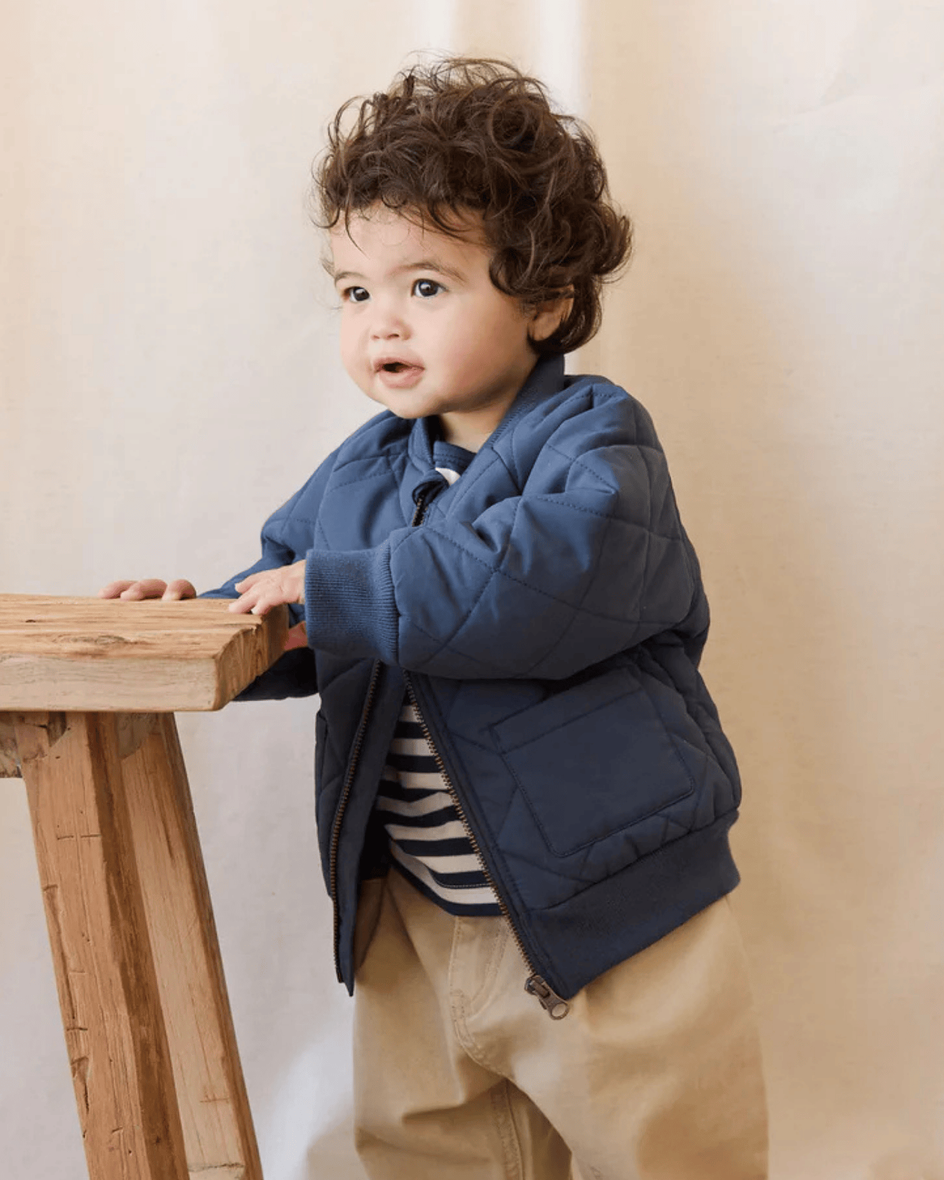the cammy jacket by jamie kay is the perfect transitional jacket for fall. the slightly oversized look is both stylish + comfy for your little. features a metal zipper + functional pockets to keep those little hands warm.