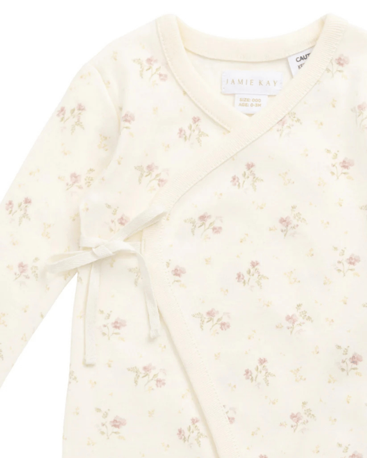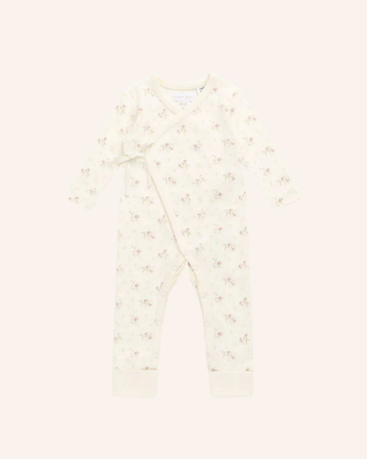 the estelle onepiece by jamie kay is the perfect sleeper or on-the-go outfit for your baby girl. this beautiful floral romper is so soft + features a wrap style with a side tie detail + snaps along the legs for easy changing.