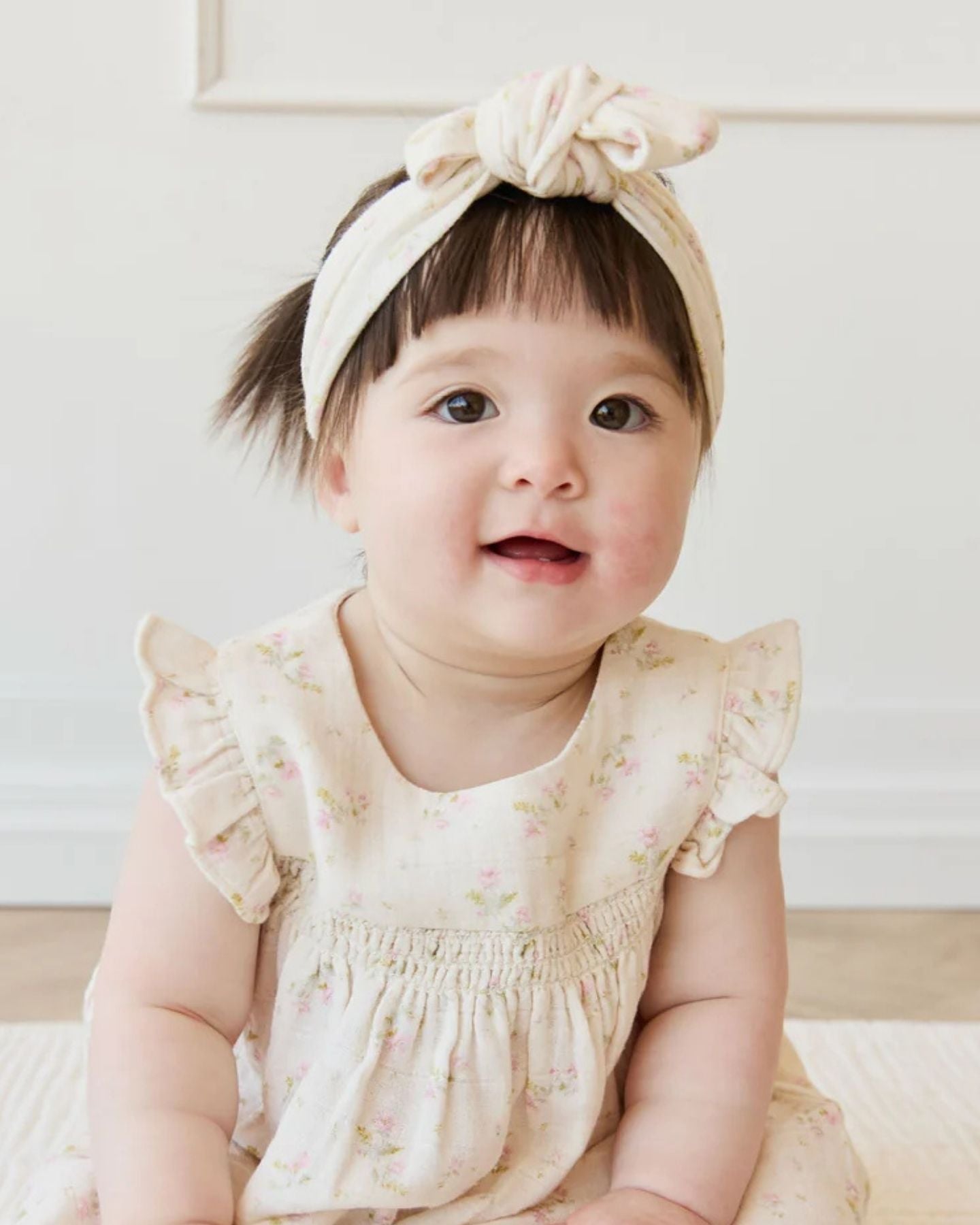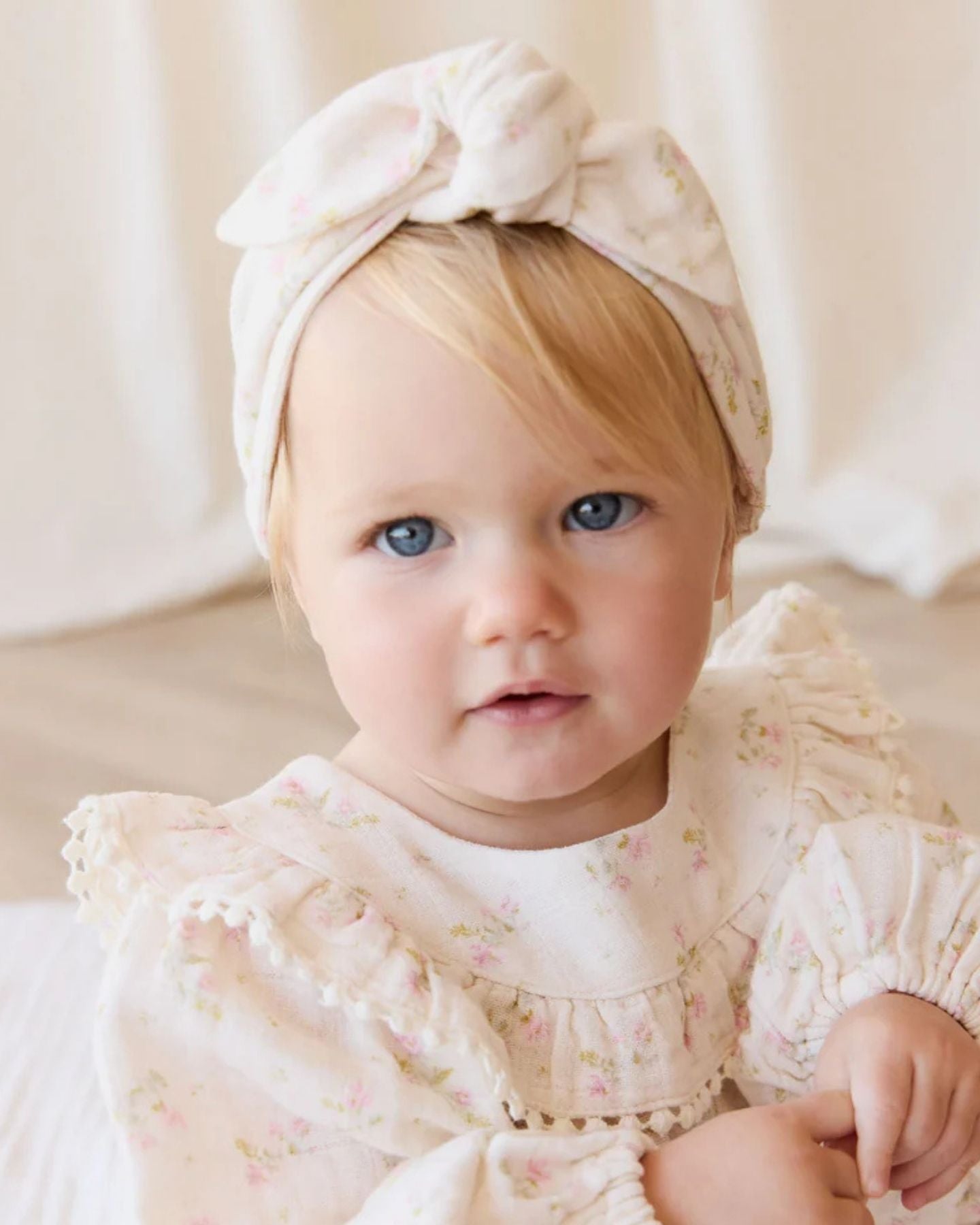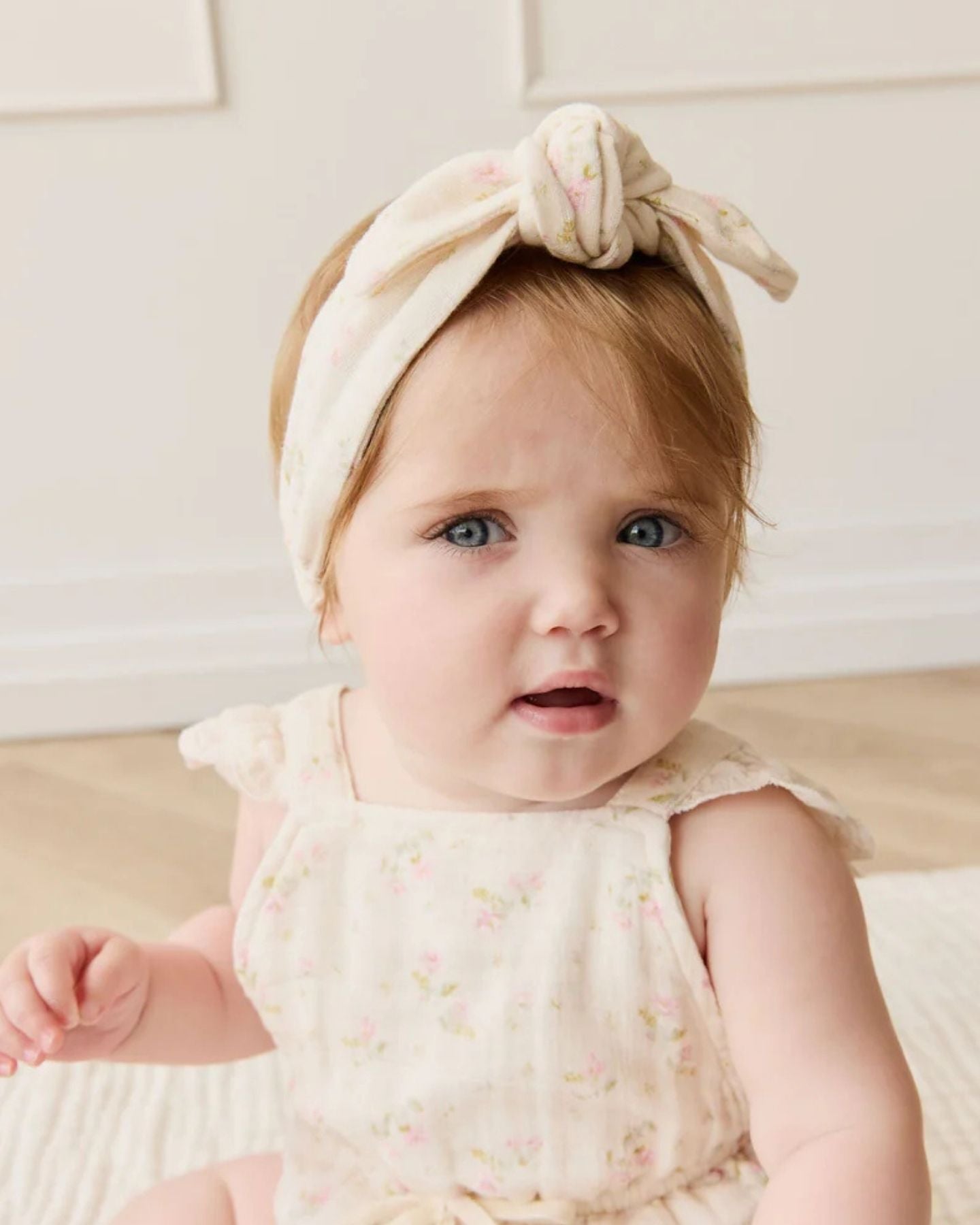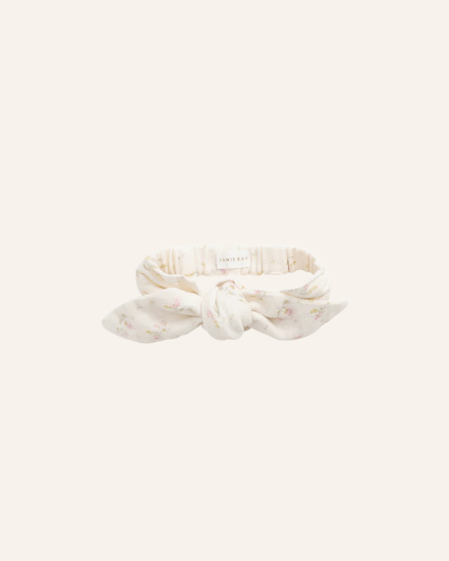 this pretty organic cotton headband by jamie kay features an elastic band, making it so easy to find the perfect fit. comfortable + stretchy, this headband is the sweetest accessory for any baby girl outfit.