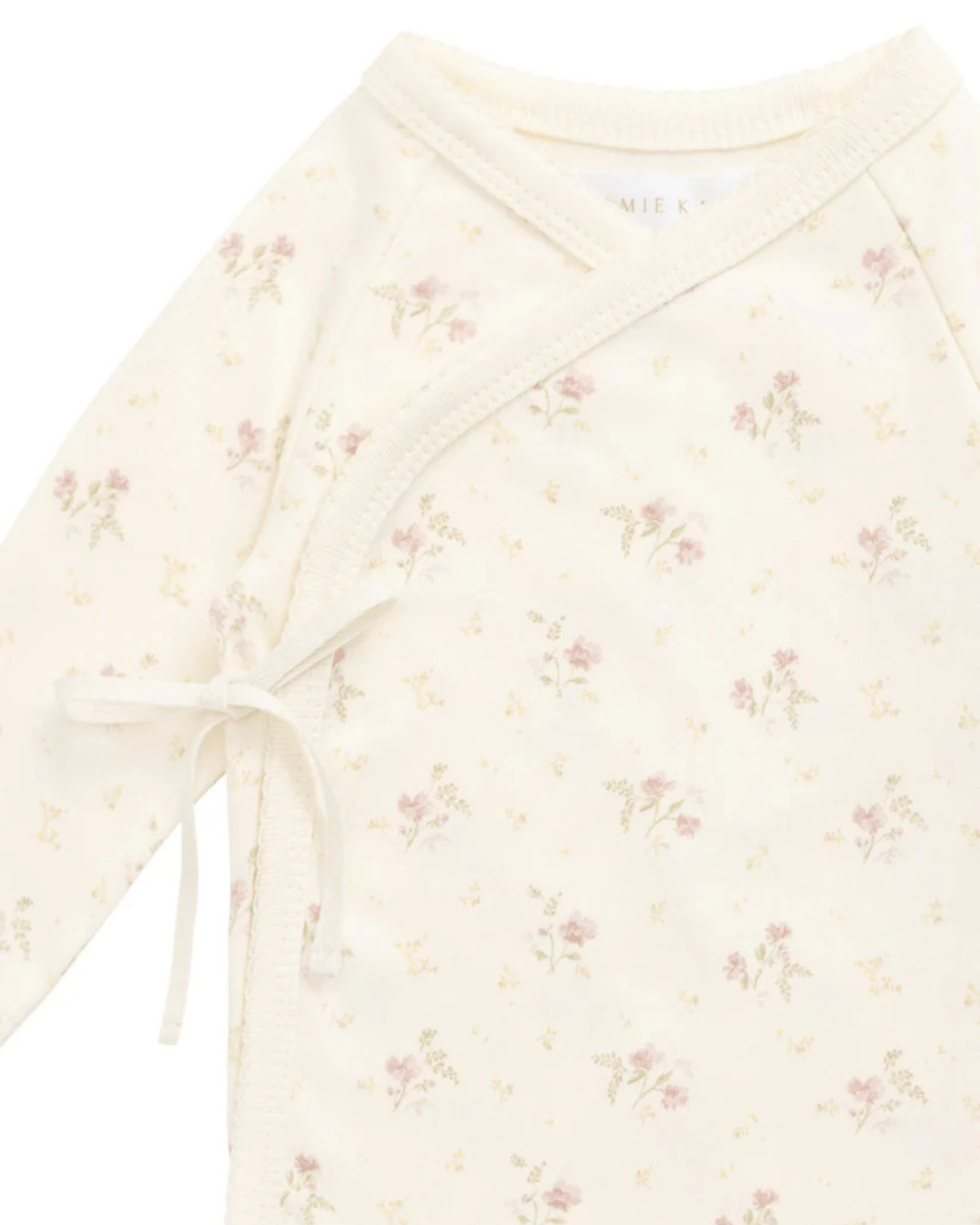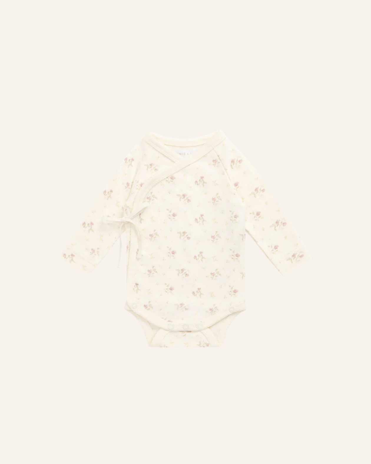 the organic cotton marina bodysuit by jamie kay features a delicate floral print + wrap design with a side tie detail. this long sleeve bodysuit offers both charm + functionality, perfect for newborns and little ones. perfect for everyday play or layering across seasons.