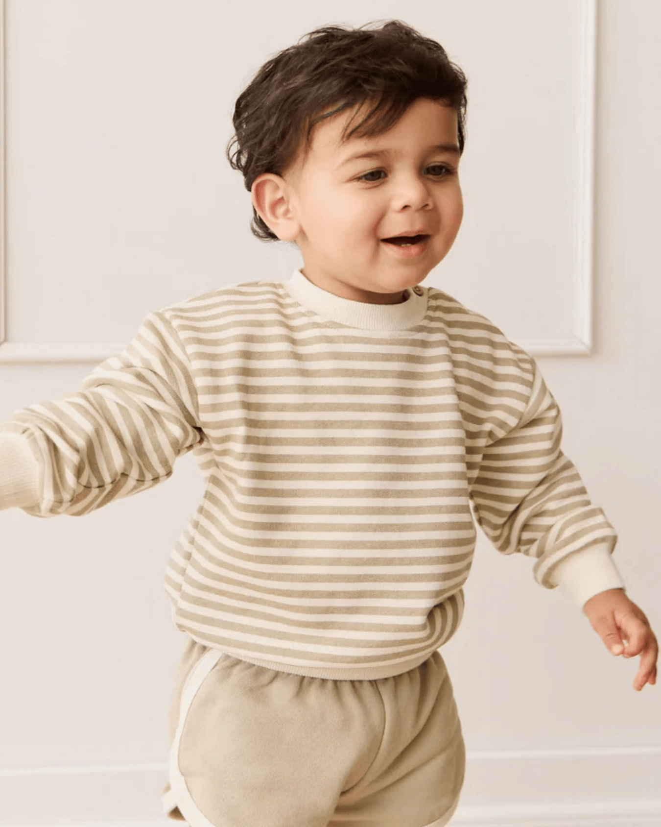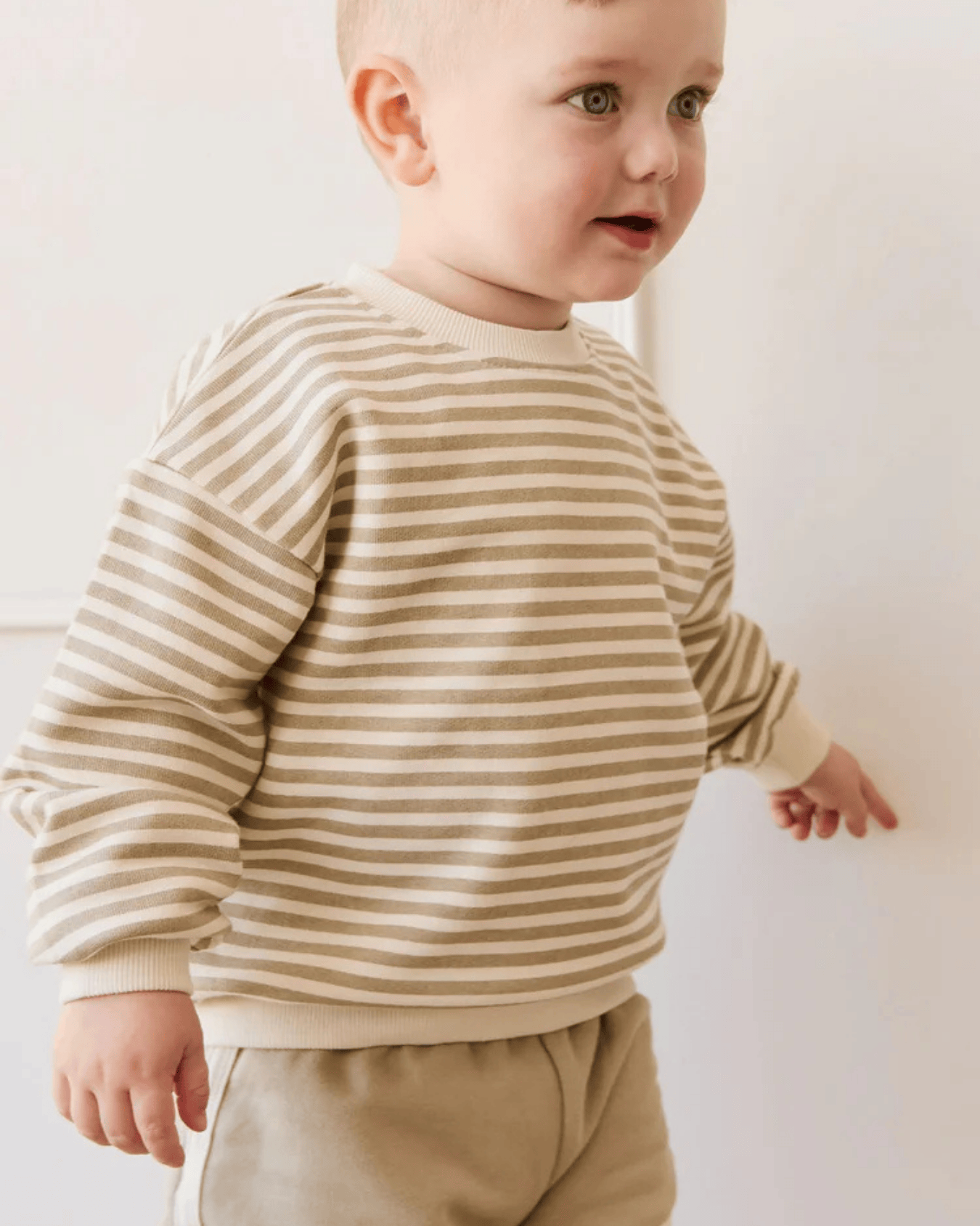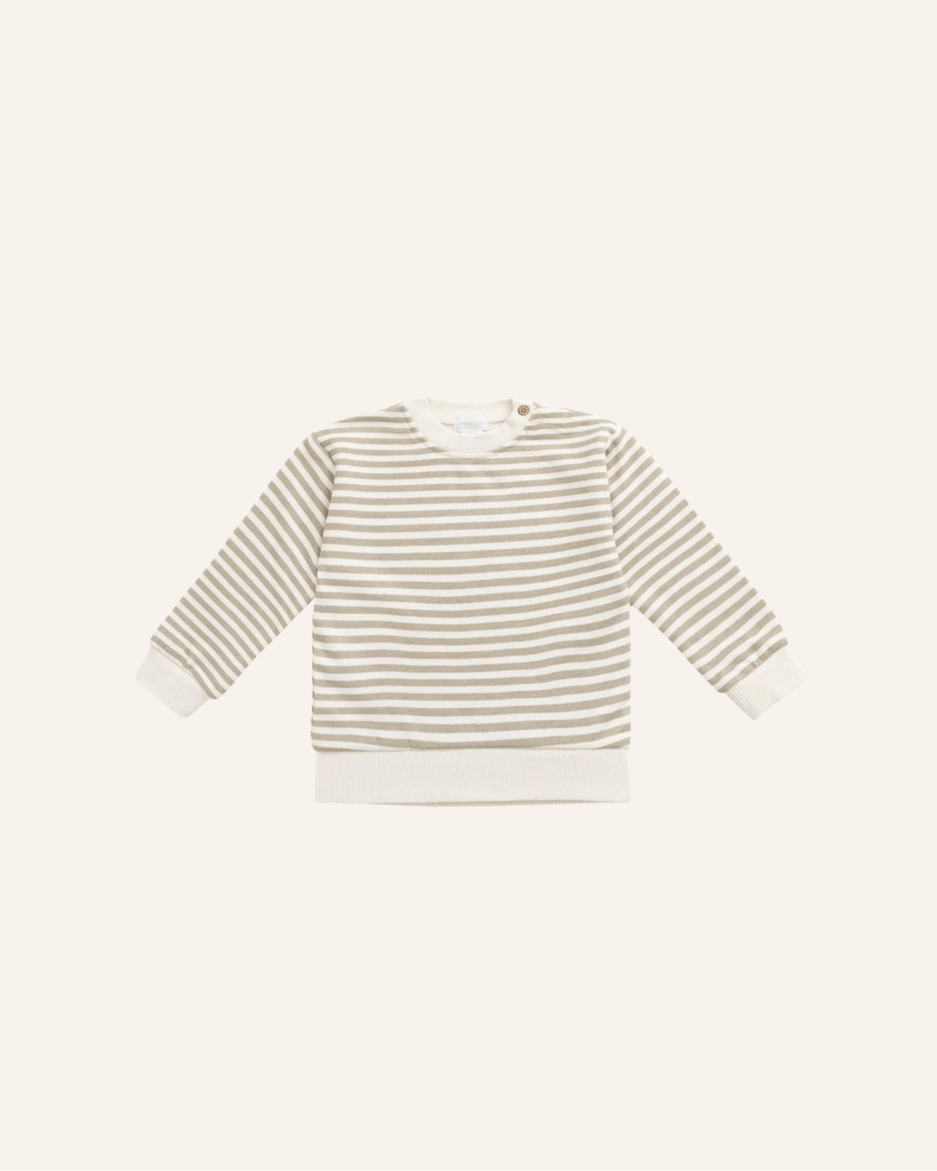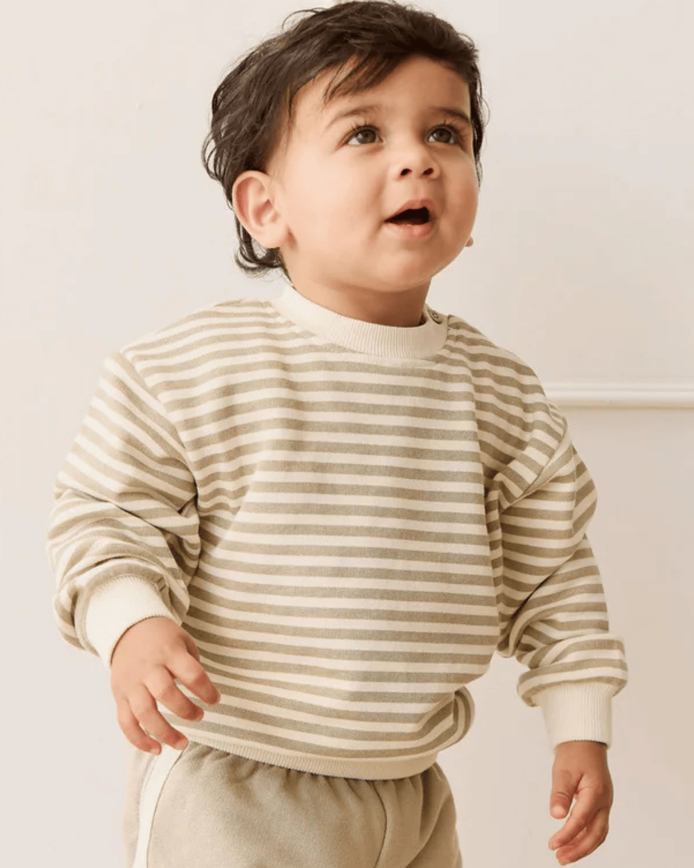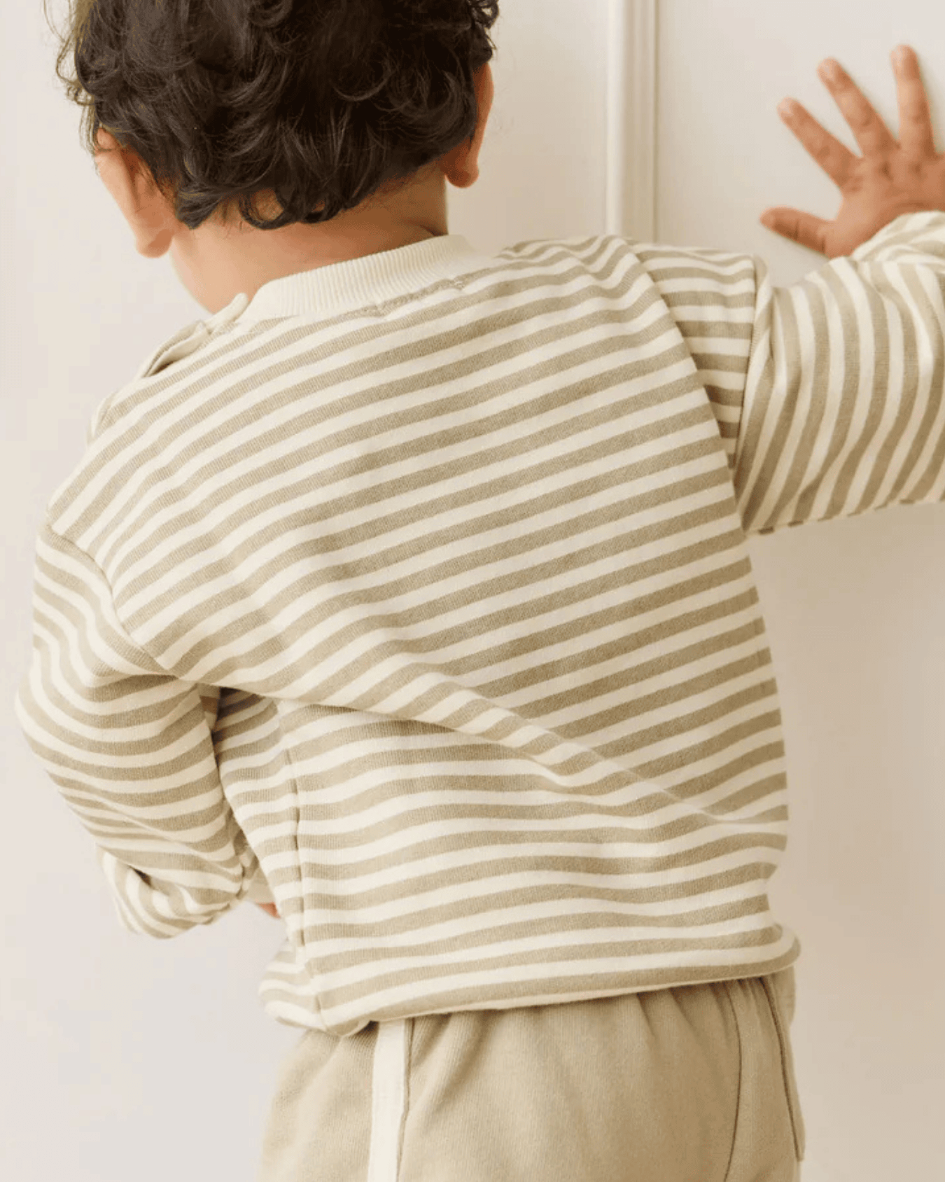 from the jamie kay bonjour cherie collection, the organic cotton peyton sweatshirt is stylish + cozy. features a classic stripe pattern + is sure to keep your little one comfy while they play all day. complete with a functioning button at the top shoulder for easy dressing.