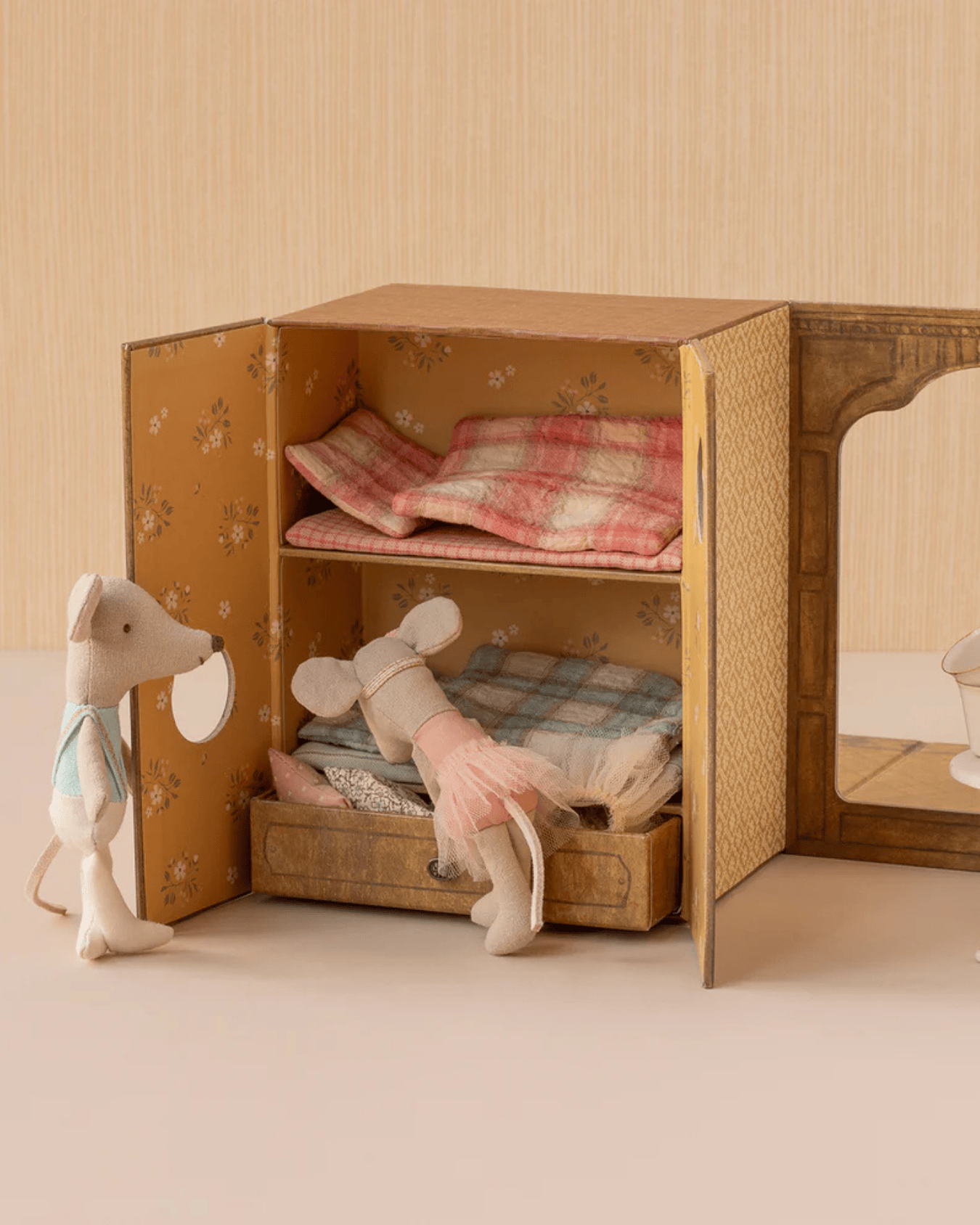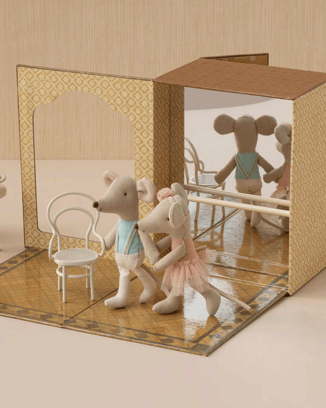 the maileg ballet mice in dance studio is the perfect addition to your little's collection. open the doors of this magical box + explore a world of dance, stardust + storytelling. this set includes a paper box, that is both a dance studio and a cozy mouse house, as well as two mice dressed for hours of dance in their beautiful clothes.