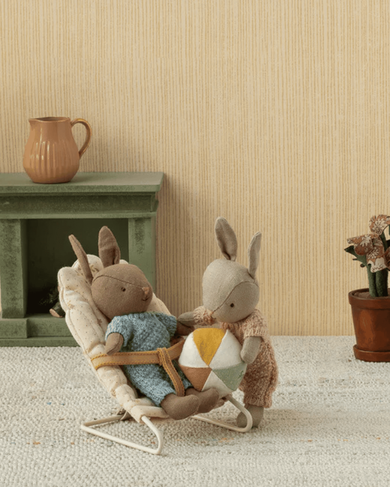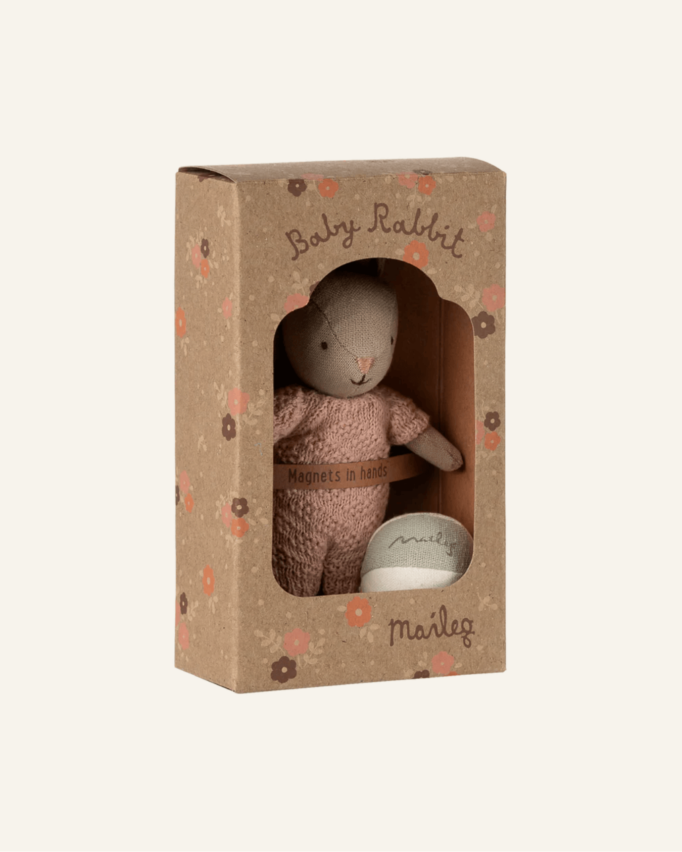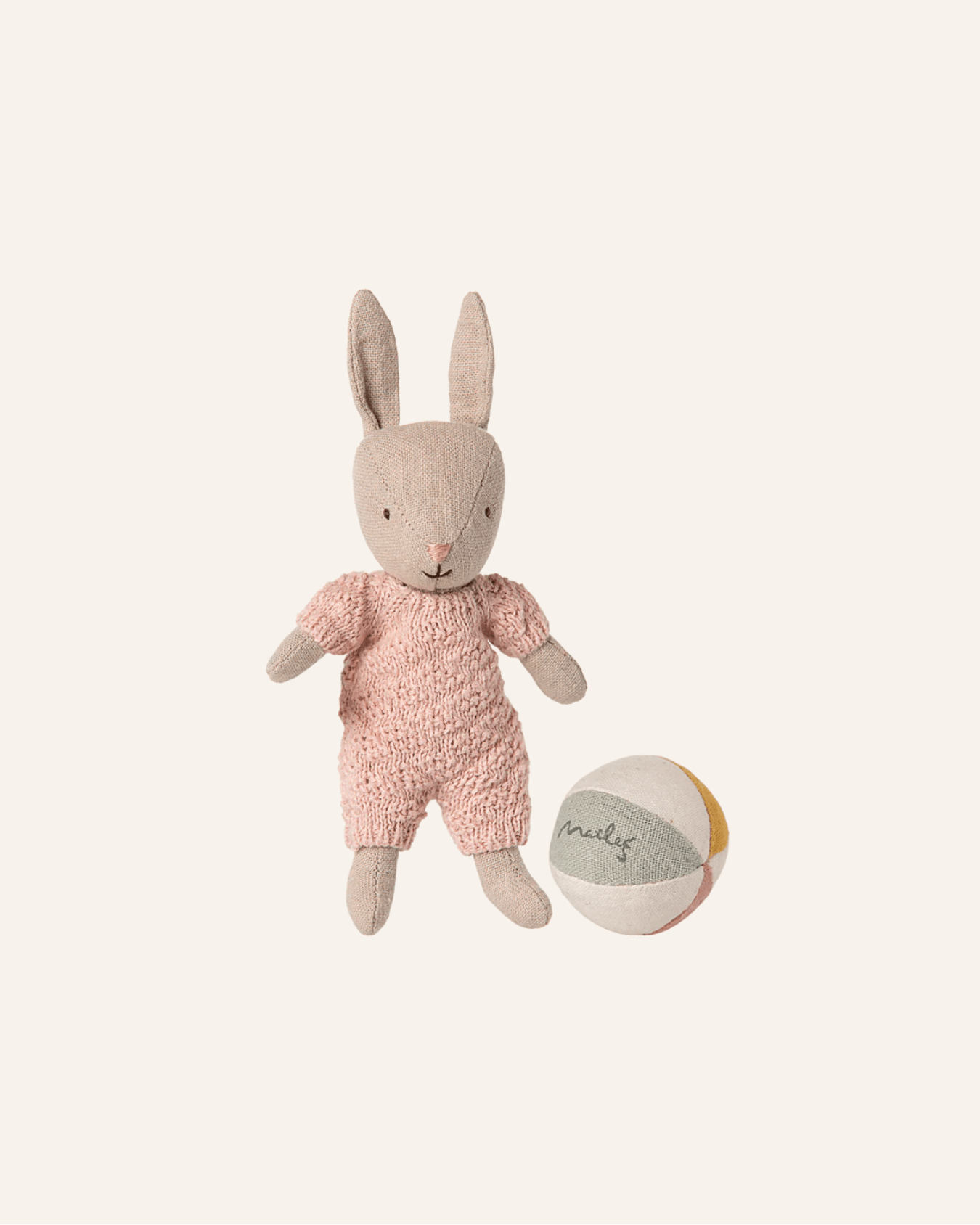 the maileg rabbit set is the perfect gift to start hours of storytelling. it contains a ball + a soft rabbit in micro size. this sweet rabbit is complete with magnets in hands to hold the ball for hours of play. all fitted nicely together + a great start of any rabbit collection.