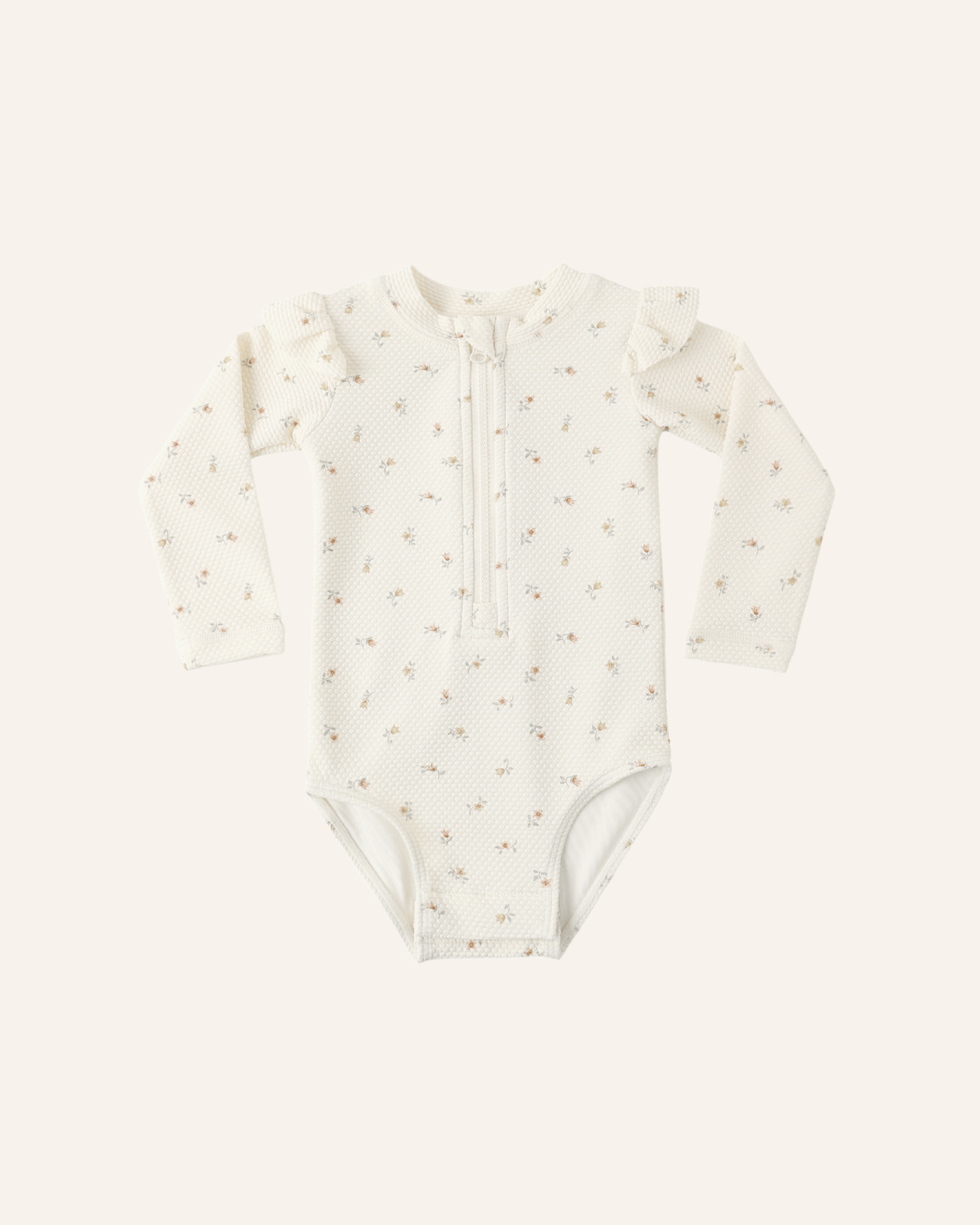 this quincy mae byron one-piece rashguard swimsuit features UPF 50+ to keep your little one protected from the sun in style. includes a zipper front closure and ruffle details at the shoulders. bottom snaps included from 0-3 months through 18-24 months.