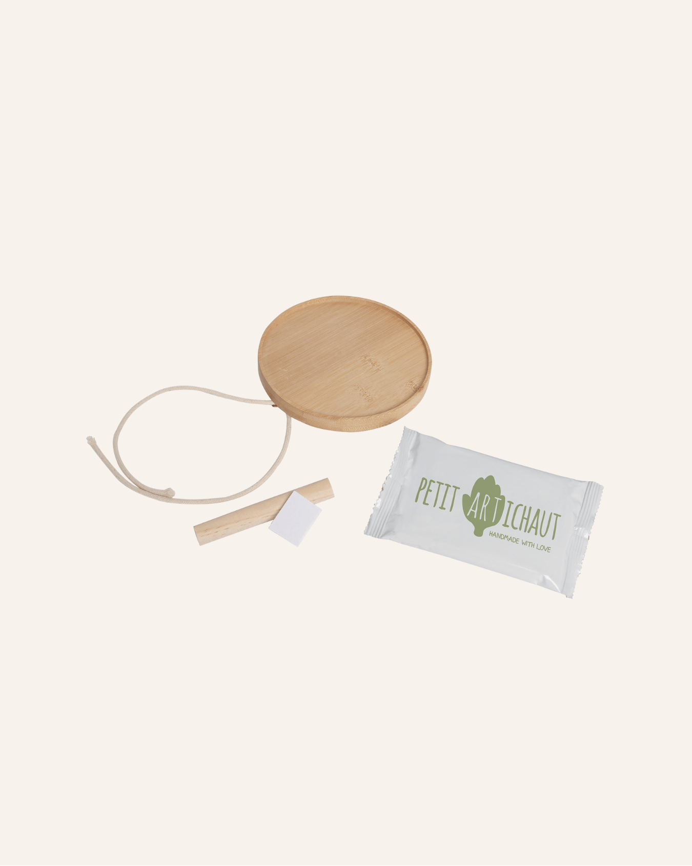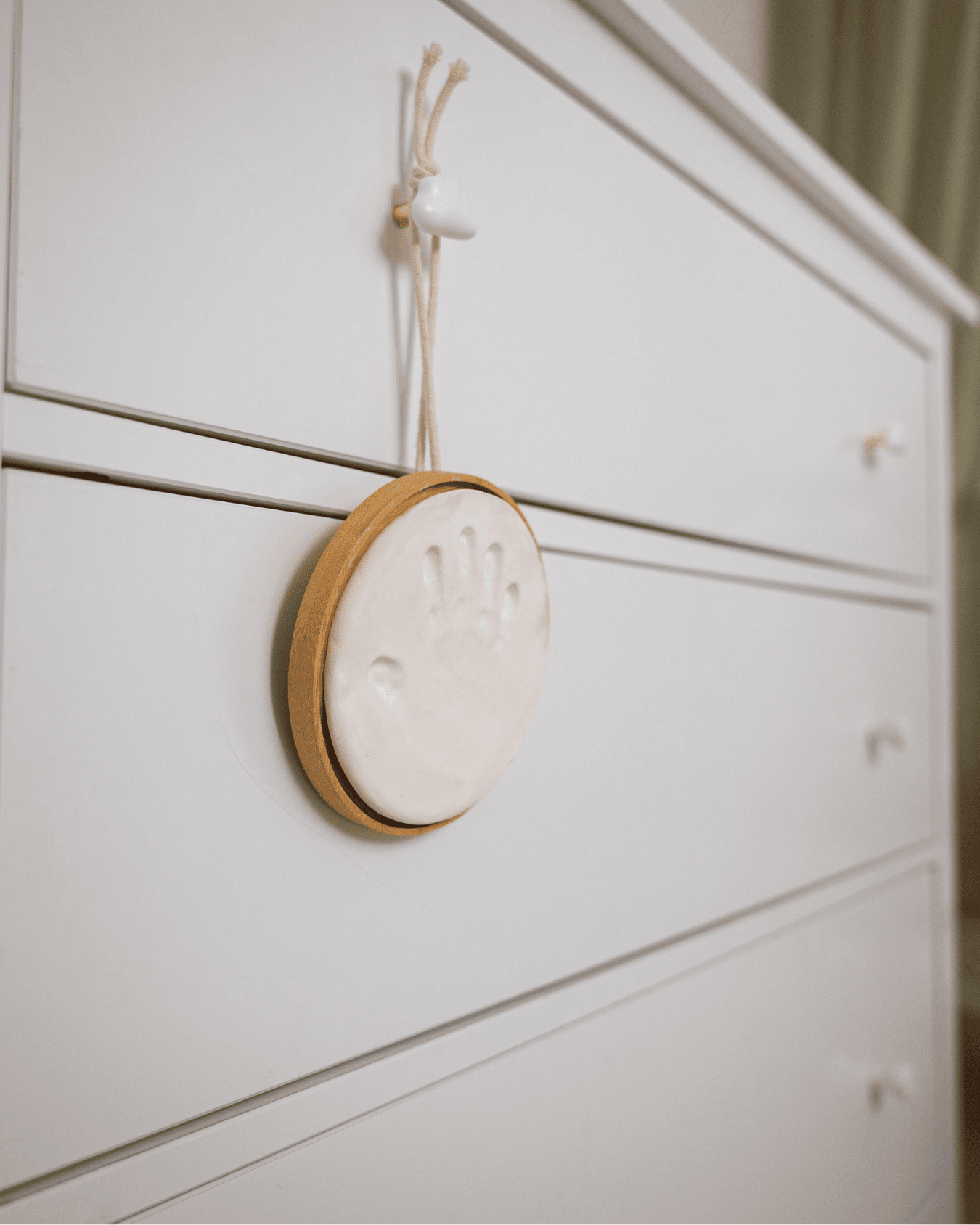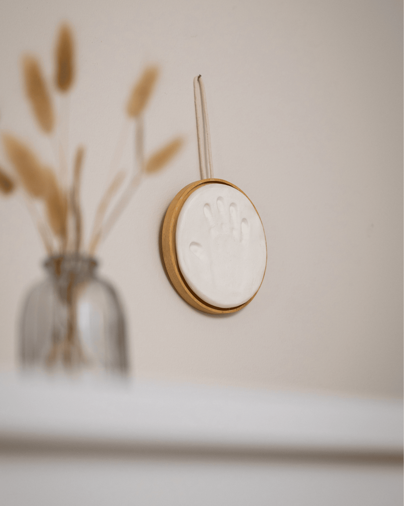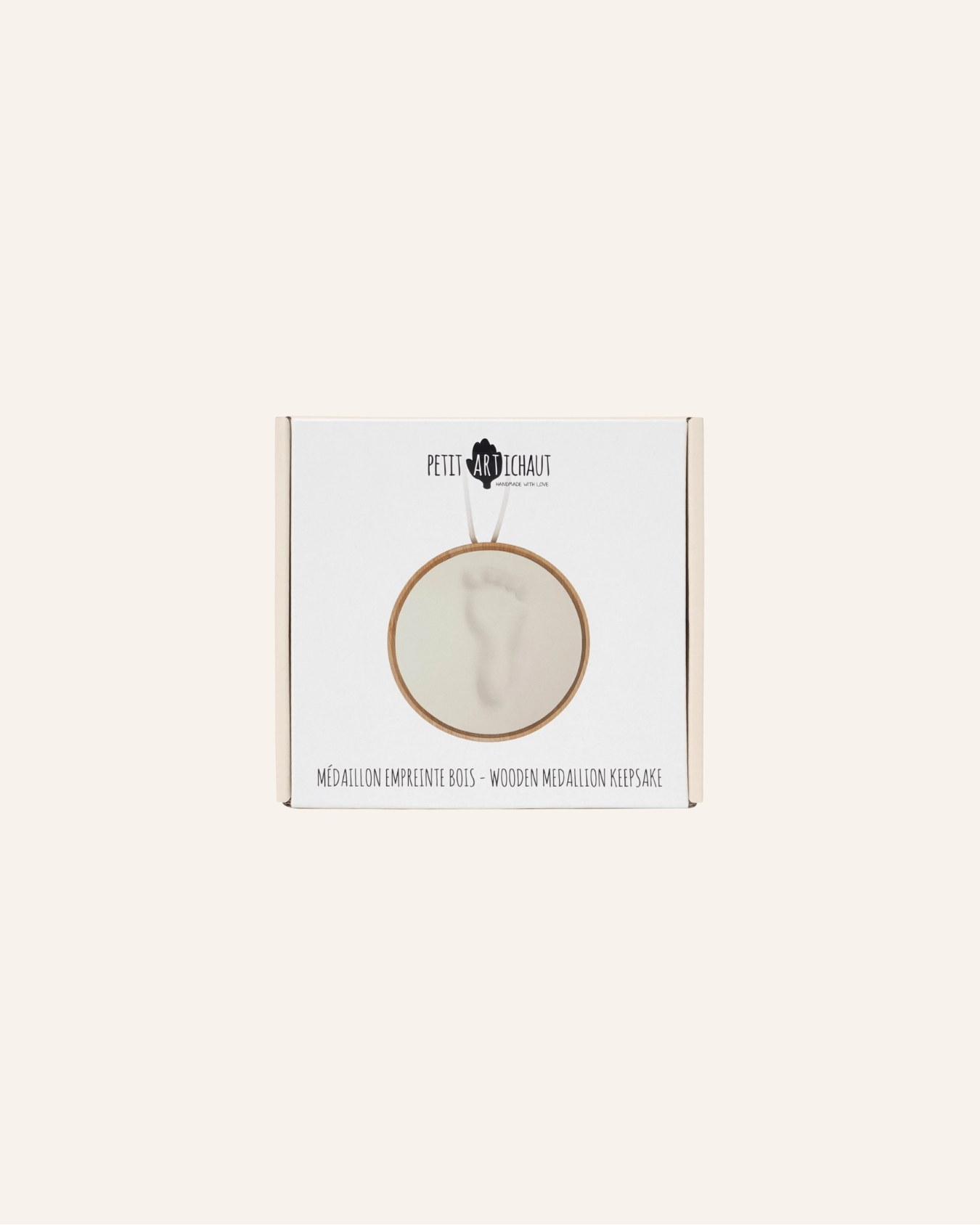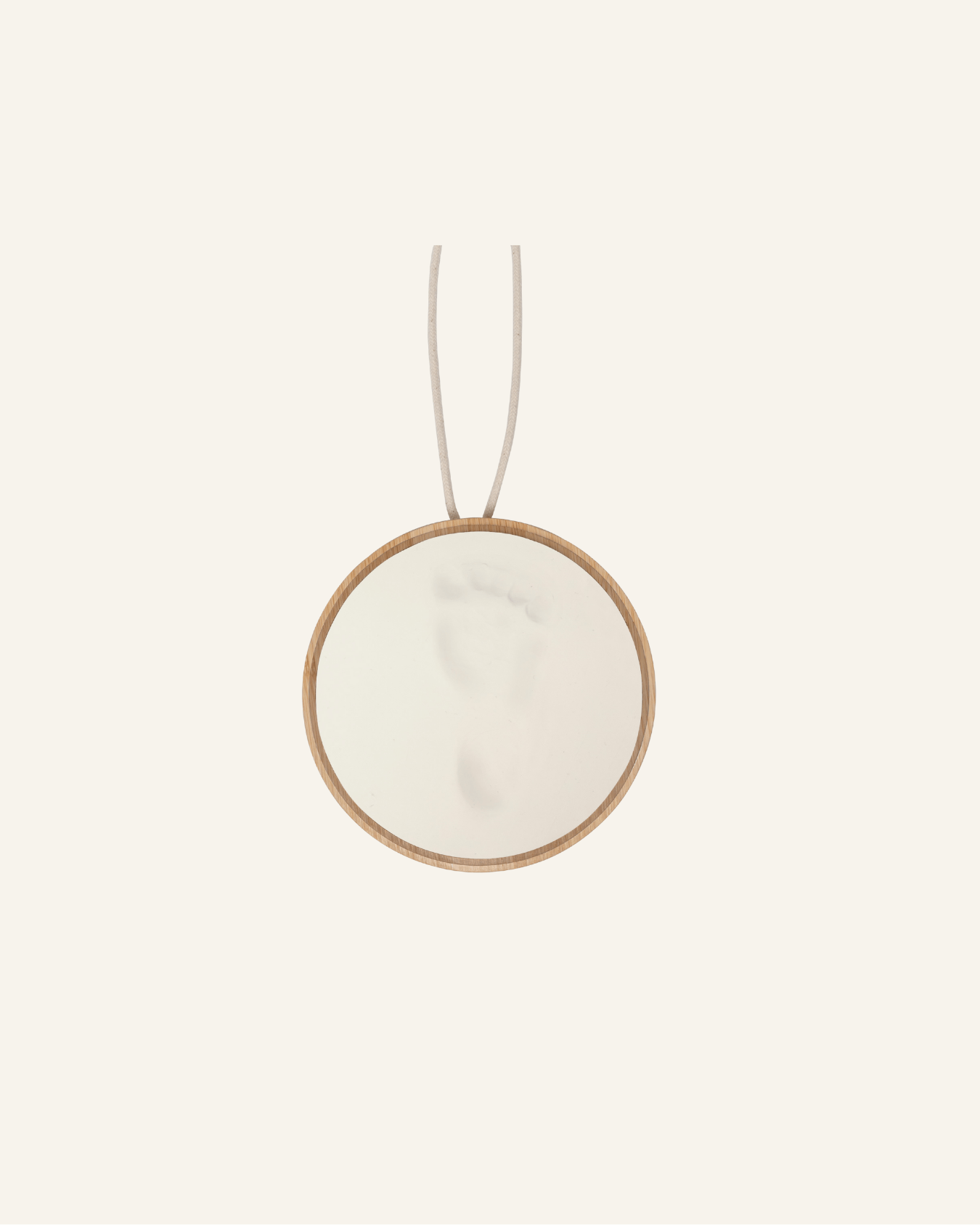 this wooden medallion keepsake ornament by petit artichaut offers a unique and elegant way to preserve your baby's hand or footprints. this complete kit includes hypoallergenic clay, a roller for application, a round wooden frame for decoration, a cord for hanging, and instructions to easily create the print. perfect for baby's first christmas.