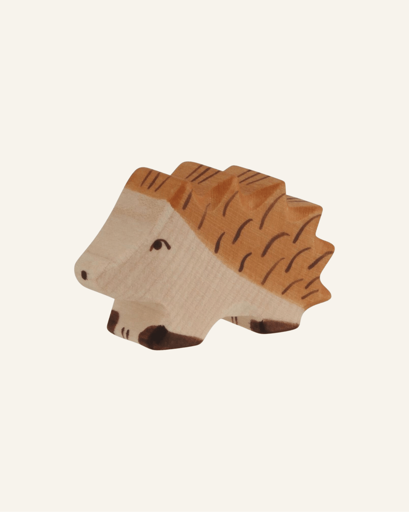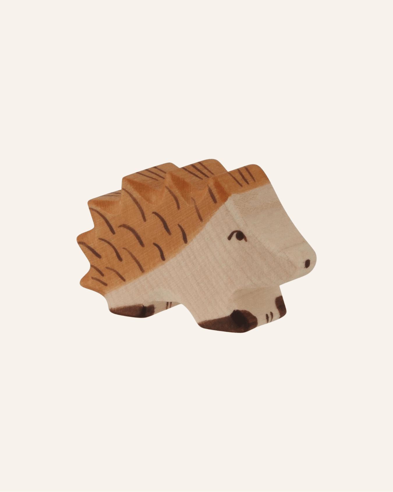 this wooden hedgehog toy is a handcrafted HOLZTIGER figurine produced by the world-renowned toy company goki. individually handcrafted from maple + beech wood, this adorable wooden hedgehog is painted using watercolors, giving it a soft color palette perfect for any nursery. let your child engage in endless pretend play with this fun animal toy.