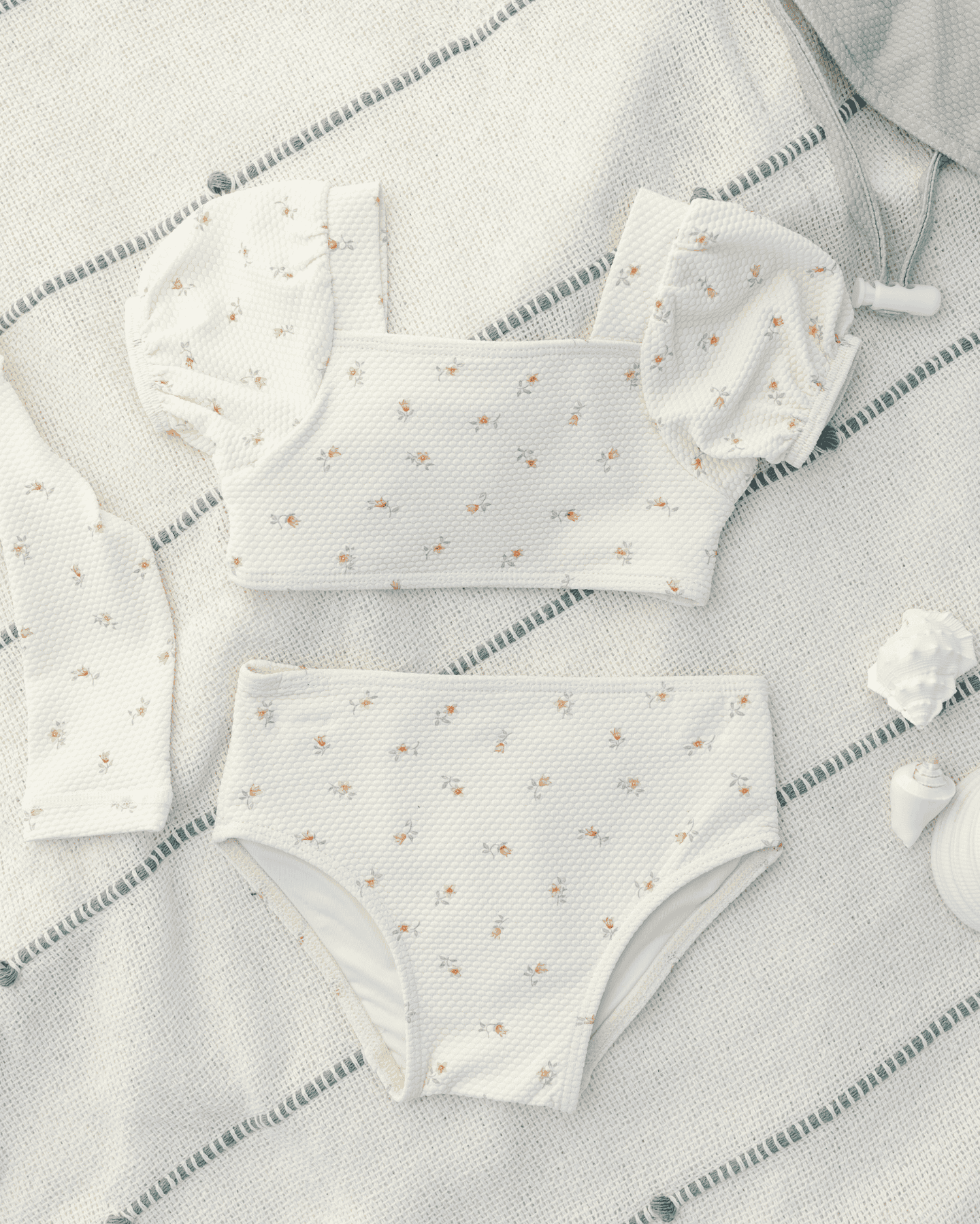 the quincy mae zippy two-piece bathing suit in a beautiful dainty floral print, featuring puff sleeves + a square neck. made of UPF 50+ material, your little will be protected from the sun in style.