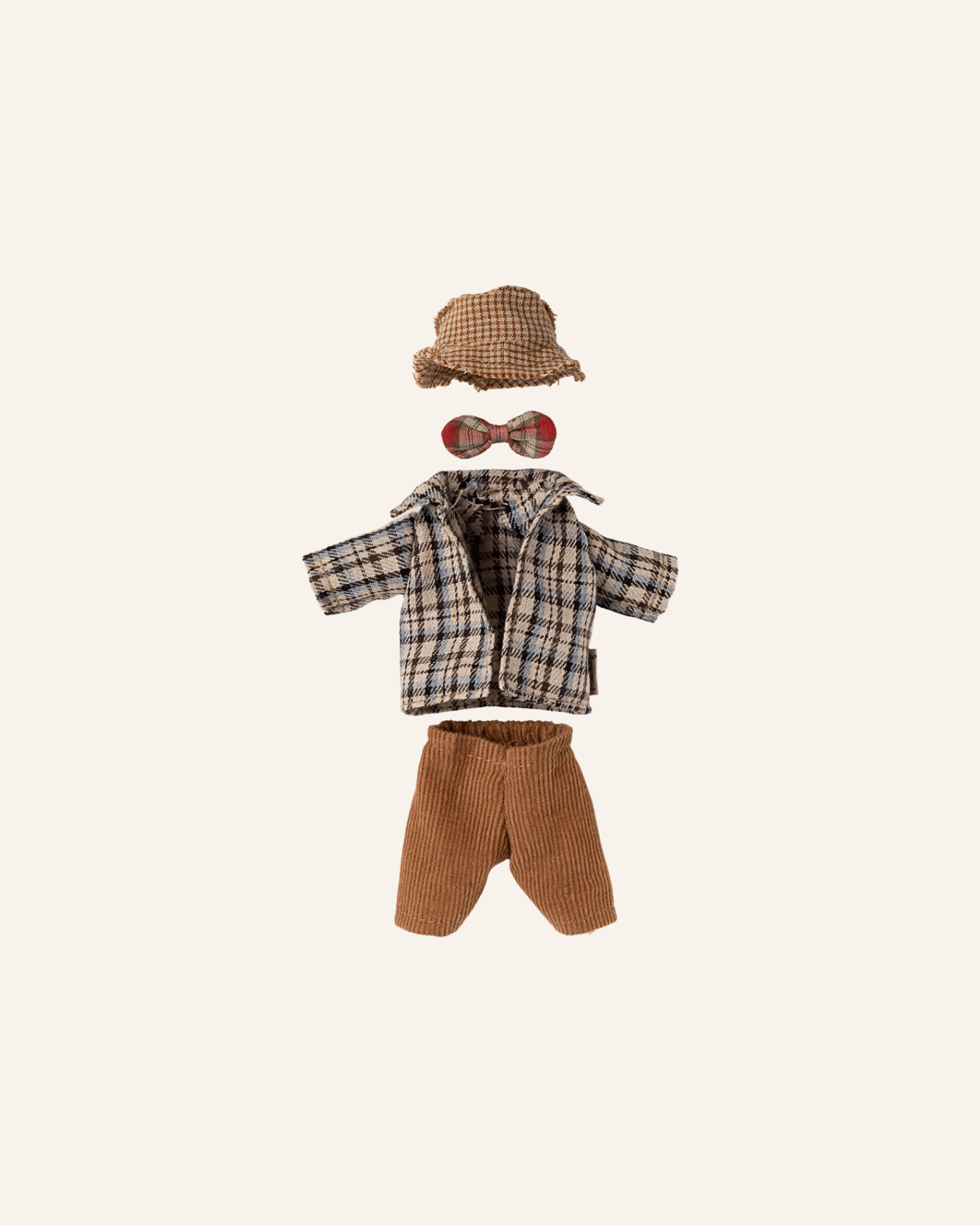 this maileg clothing set is the perfect fit for your dad mouse, it will make him look just like granddad mouse. if you need a new set of clothes for your mouse this set will be a good choice. this set consists of a checked shirt, a straw hat + bowtie, complete with corduroy pants. mouse not included.