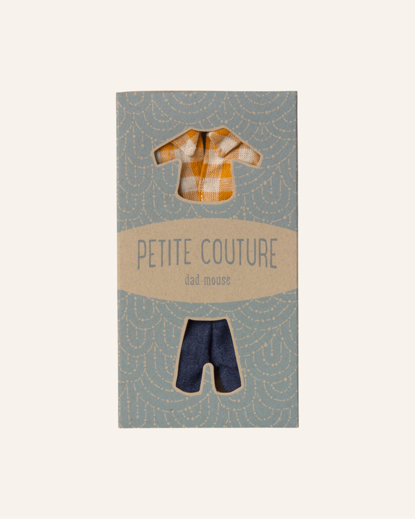 this maileg clothing set is the perfect fit for your dad mouse. if you need a new set of clothes for your mouse this set will be a good choice. this set consists of a yellow checked shirt + pair of jeans. clothing set comes in box as shown is second photo. mouse not included.