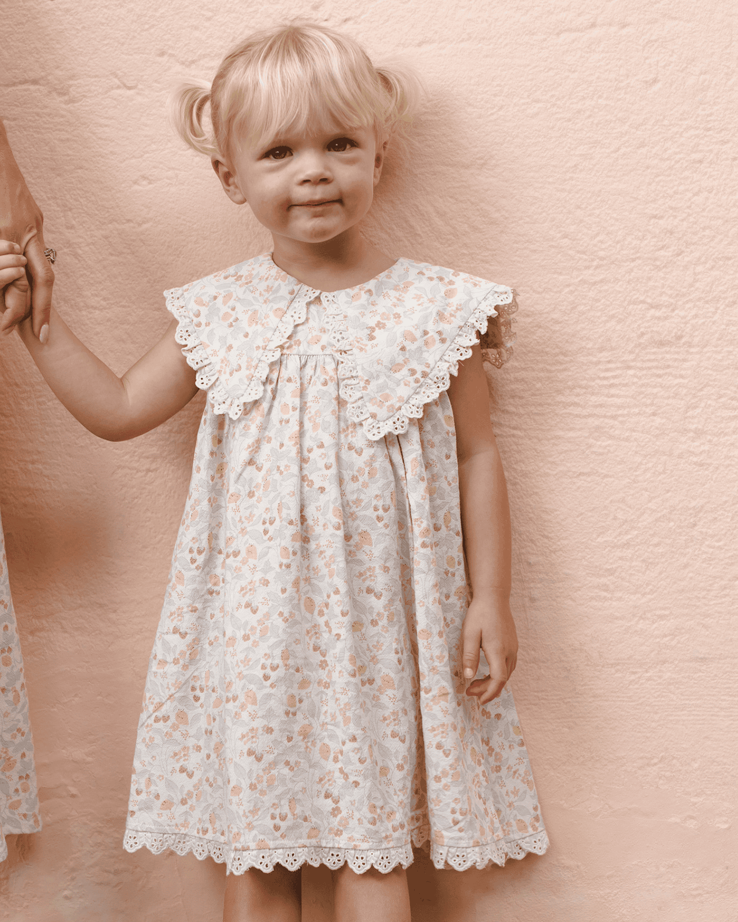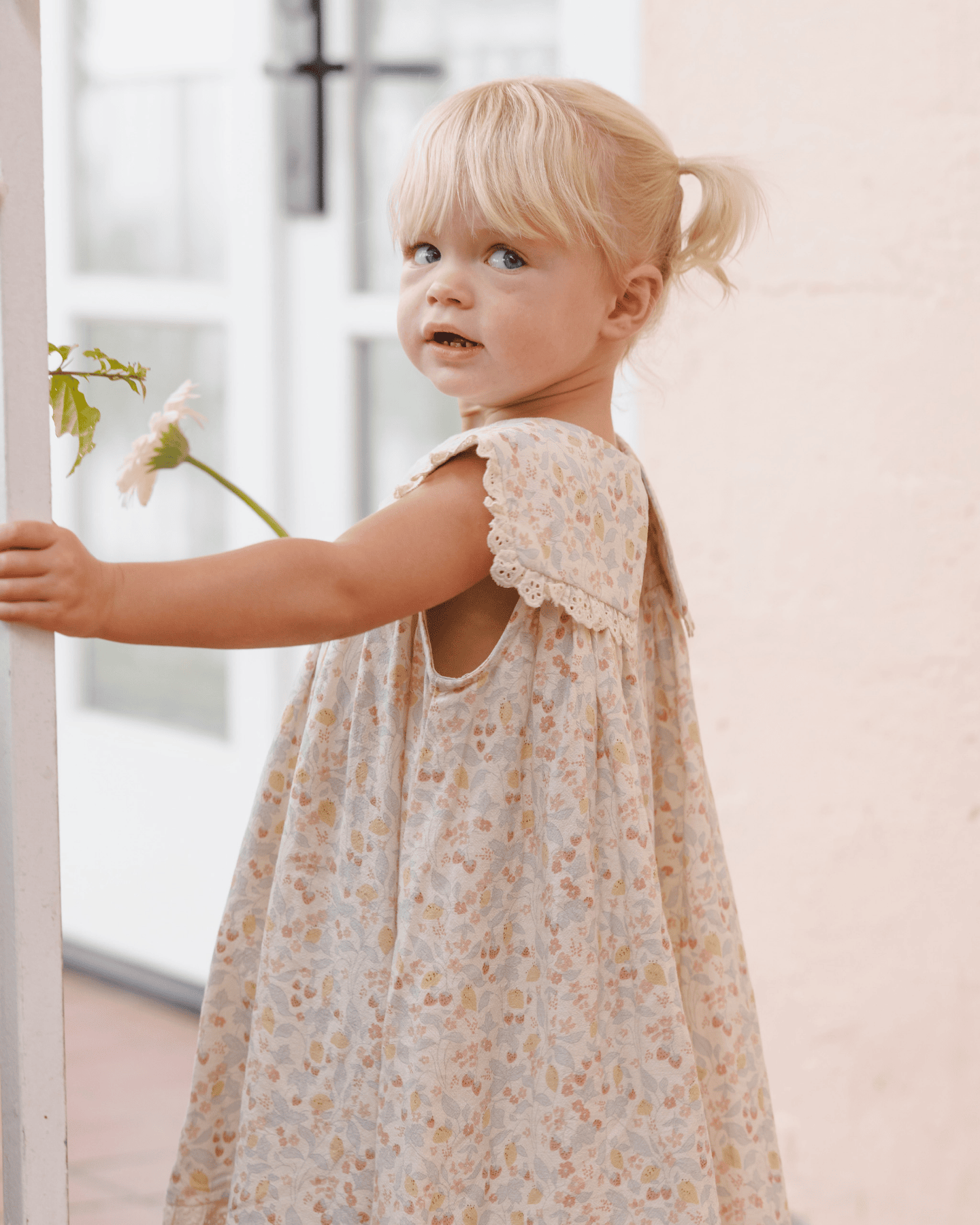 this fun + fancy porter dress by rylee + cry is a vintage-inspired standout with its darling oversized sailor v collar + pleated skirt with eyelet detail. the perfect dress for welcoming summer with the beautiful pink floral print. coordinating bloomers included with sizes 12-18m - 2-3y.