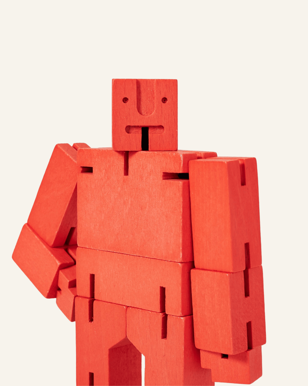 this classic wooden cubebot by areaware, inspired by Japanese shinto kumi-ki puzzles, is a non-traditional take on the toy robot. cubebots's powerful hardwood frame can hold dozens of poses, and his elastic-band muscles + durable wood limbs make him impervious to breakage. when it's time for him to rest, he folds into a perfect cube. an enduring classic that will withstand generations of play.