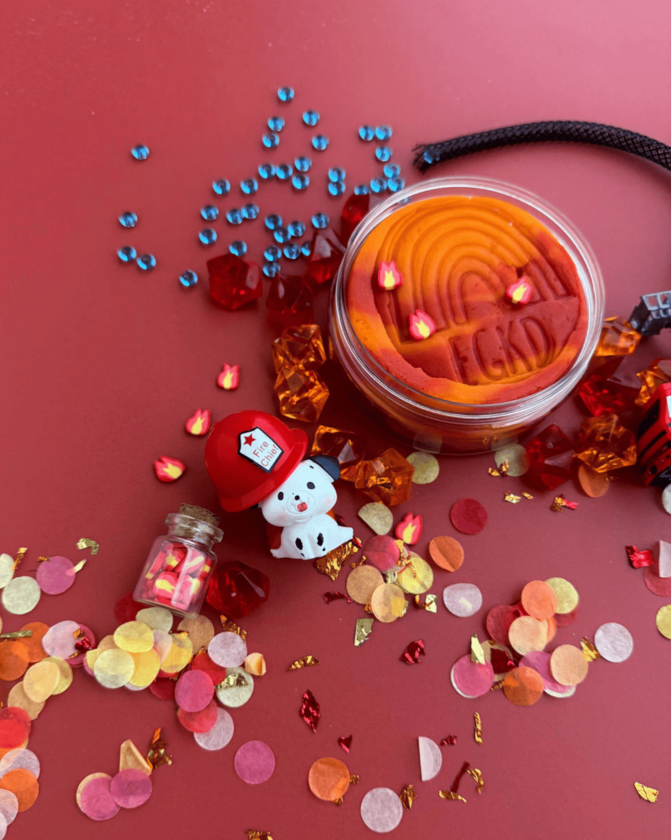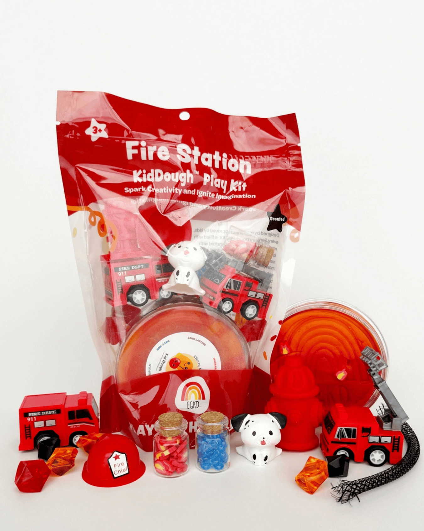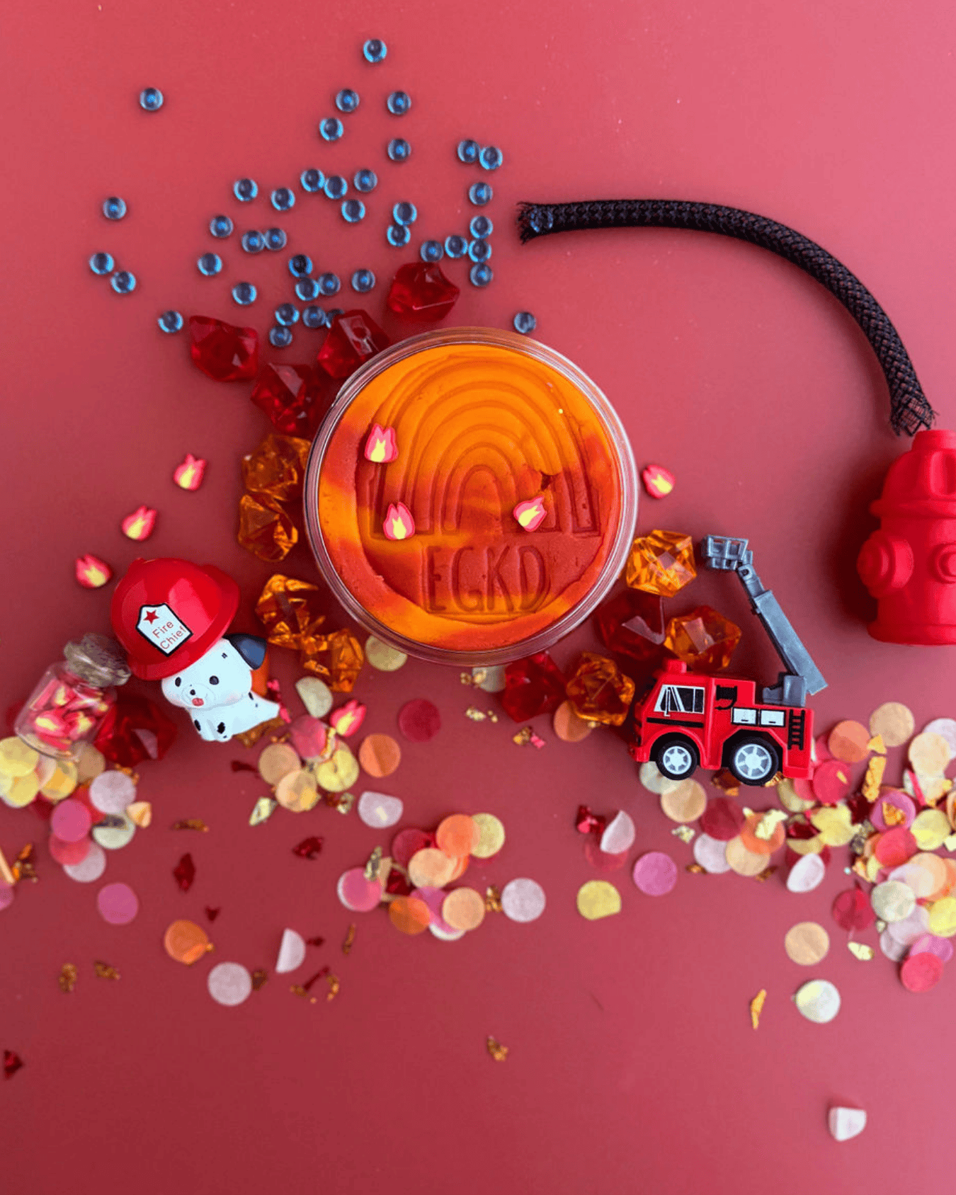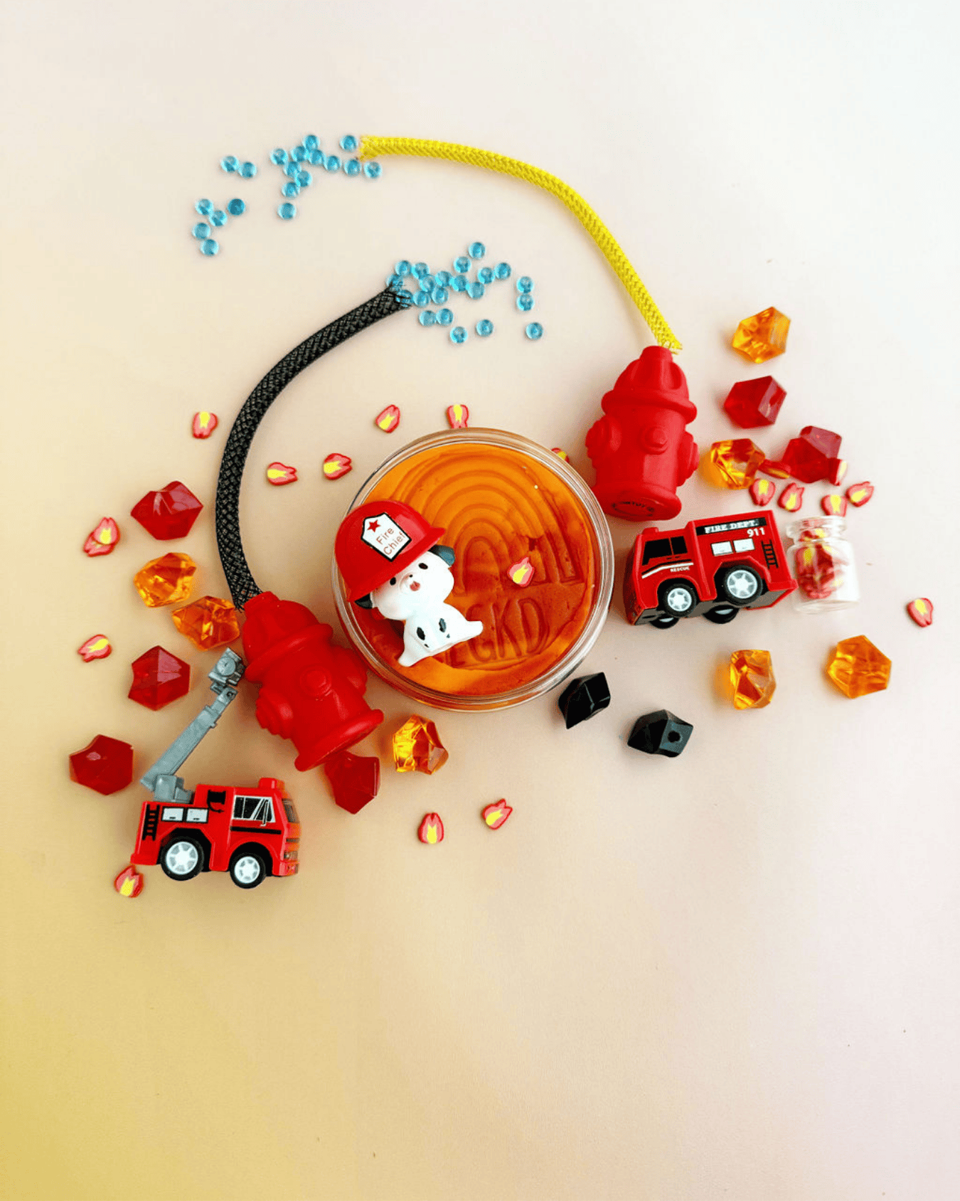 fire station kit includes: 8 oz red + orange marbled (cherry mango) kiddough, 2 jars of mix ins (fire + water beads), dalmatian puppy, fire hydrant, red+ orange Acrylics.