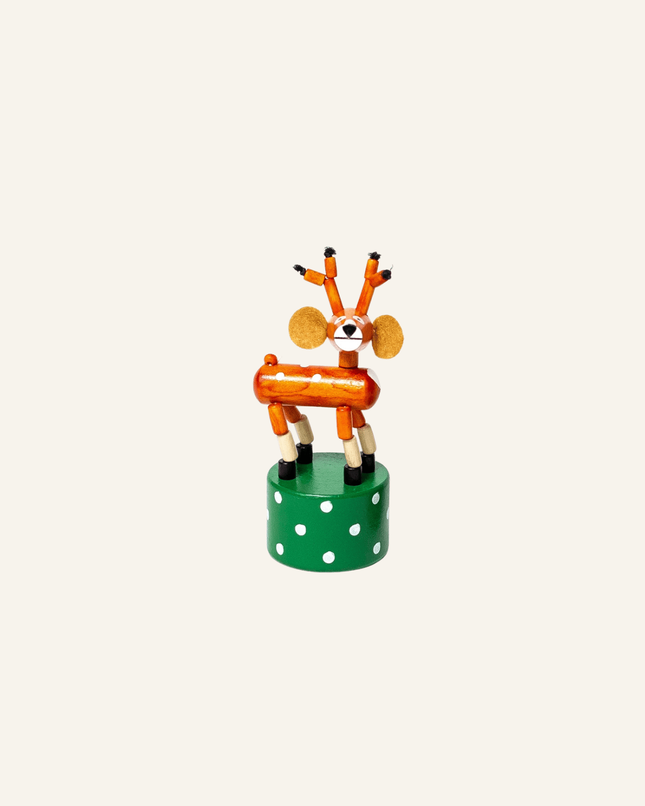 the reindeer push puppet by jack rabbit creations is loads of holiday fun. push the bottom button and watch him collapse - then let go + he pops back up - ready for more action. a classic wooden toy that makes a great stocking stuffer.