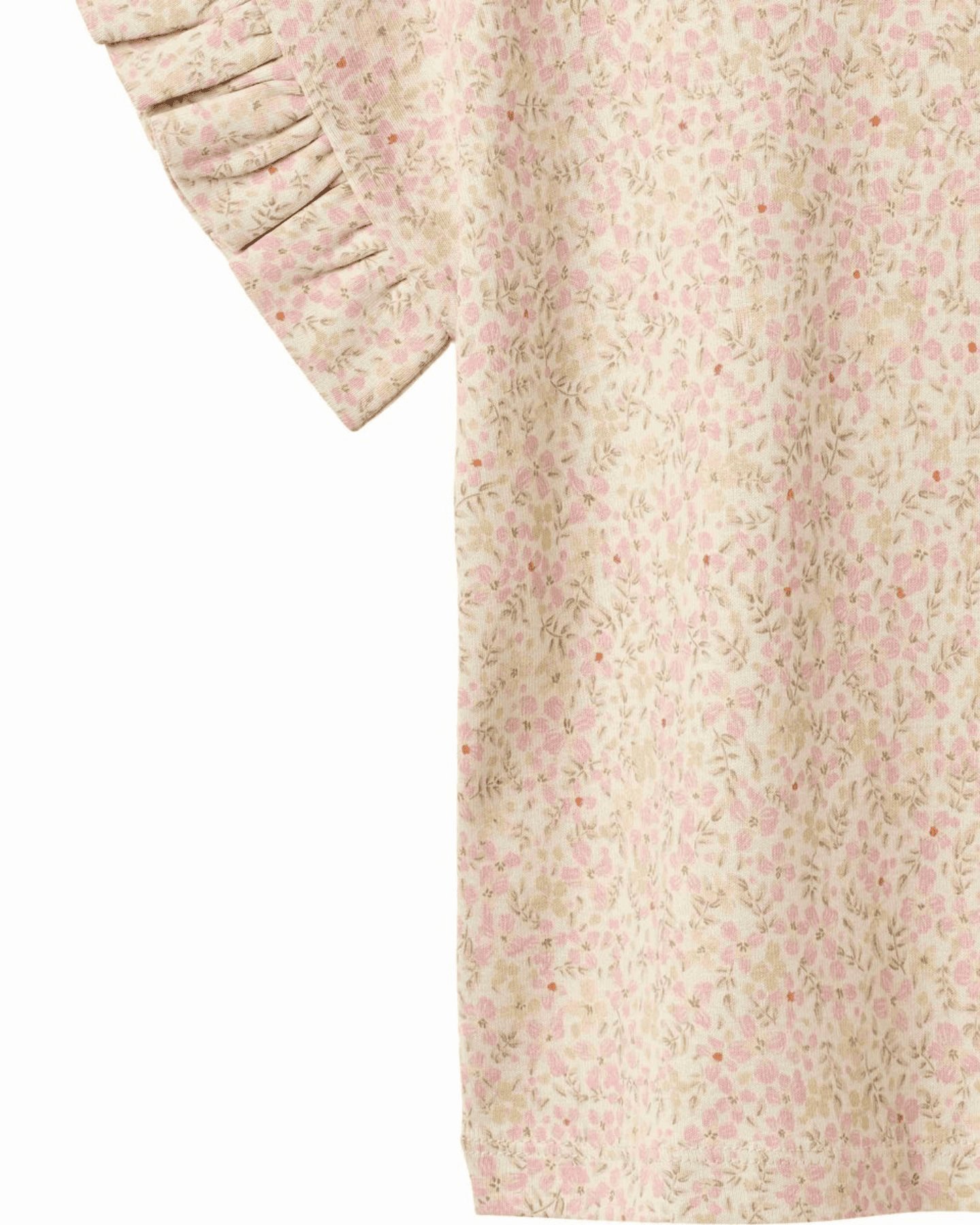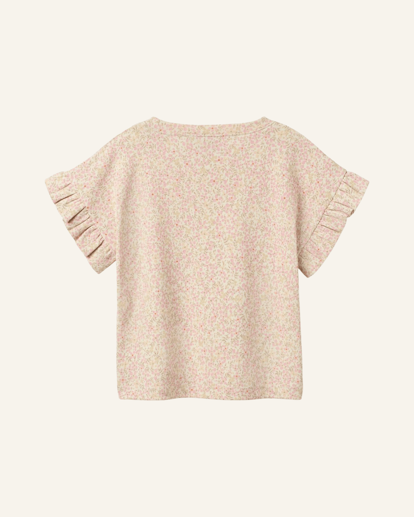 the ally shirt by wheat is the sweetest pink floral top your little girl will love. the fun print + ruffle sleeves make this top extra special.