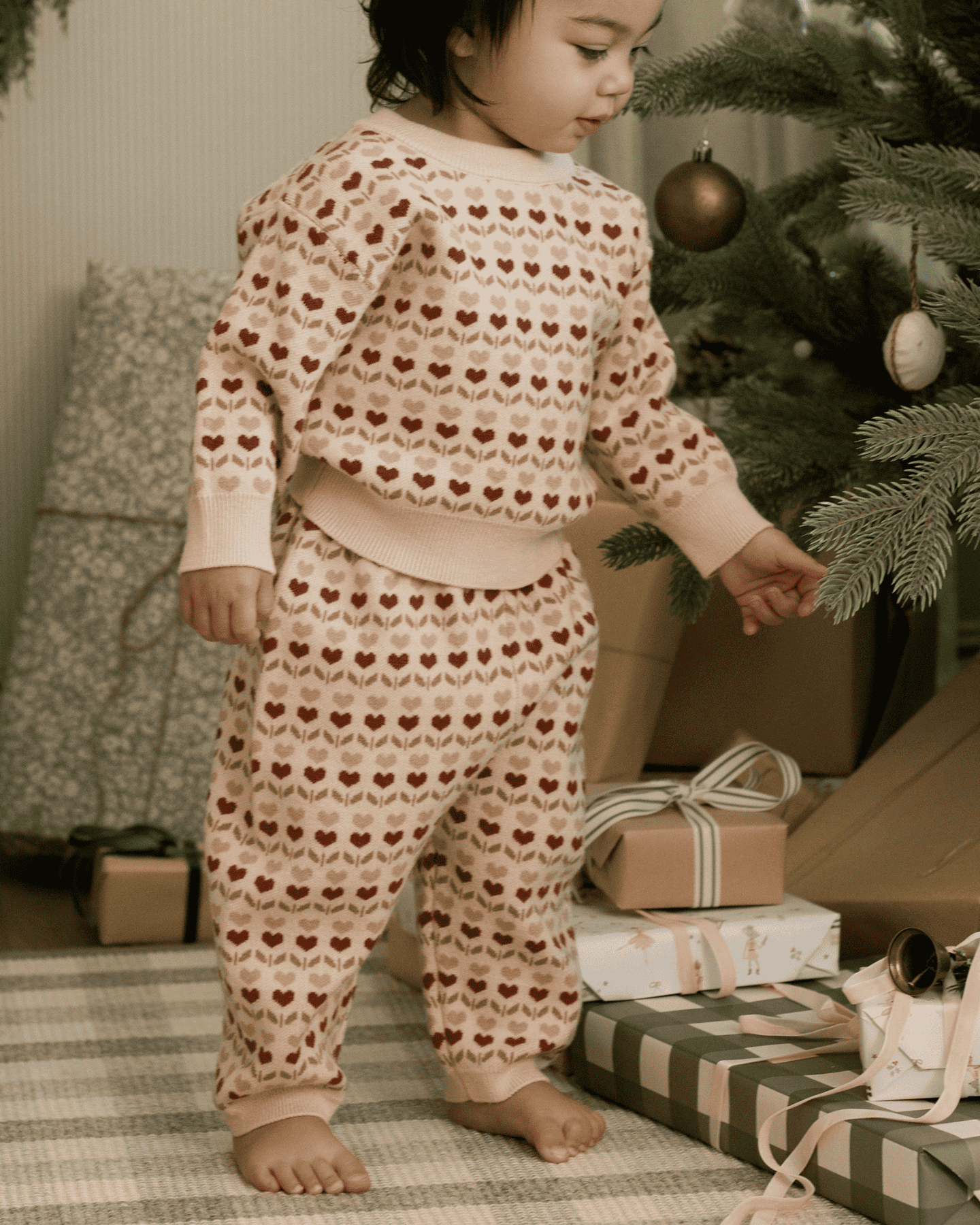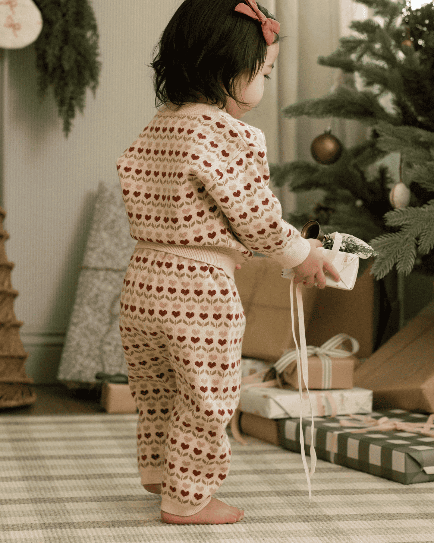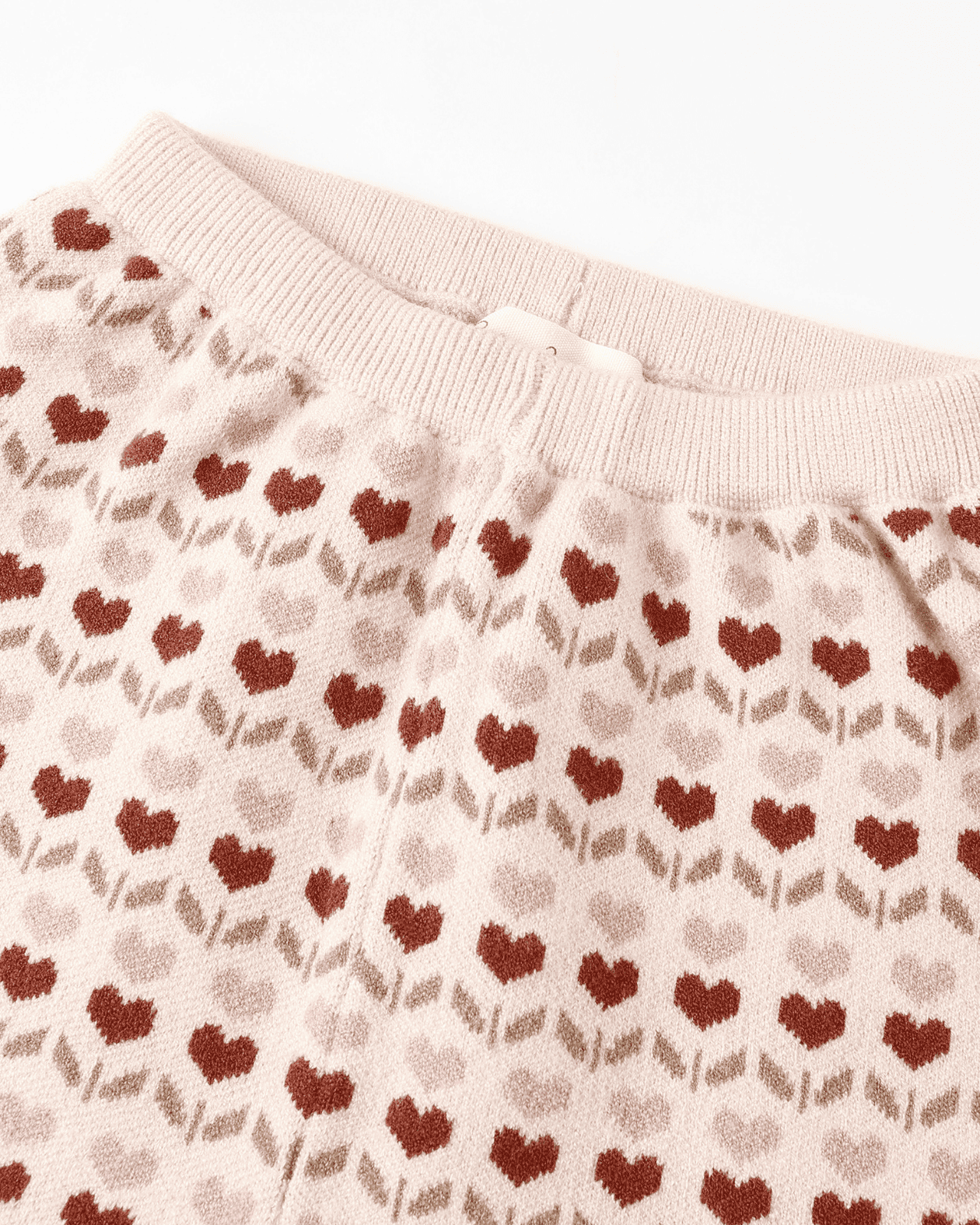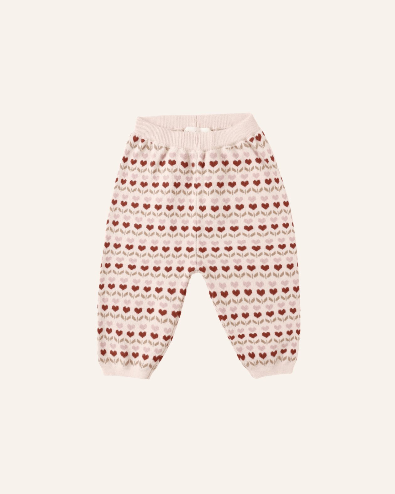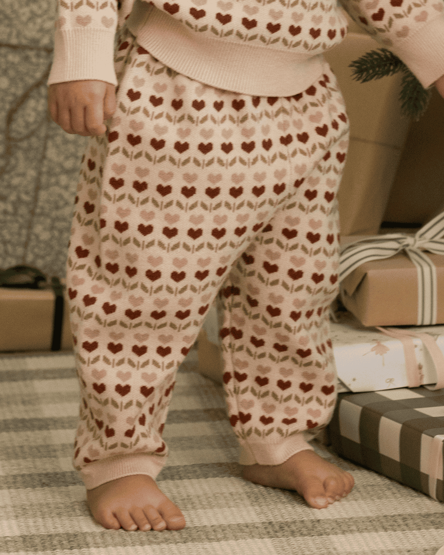 the knit pants by rylee + cru are a warm + cozy sweater pant to add to your little girl's wardrobe this fall + winter.  featuring a jacquard knit with a fun heart print, we love these pants for playdates, family photos + holiday parties.